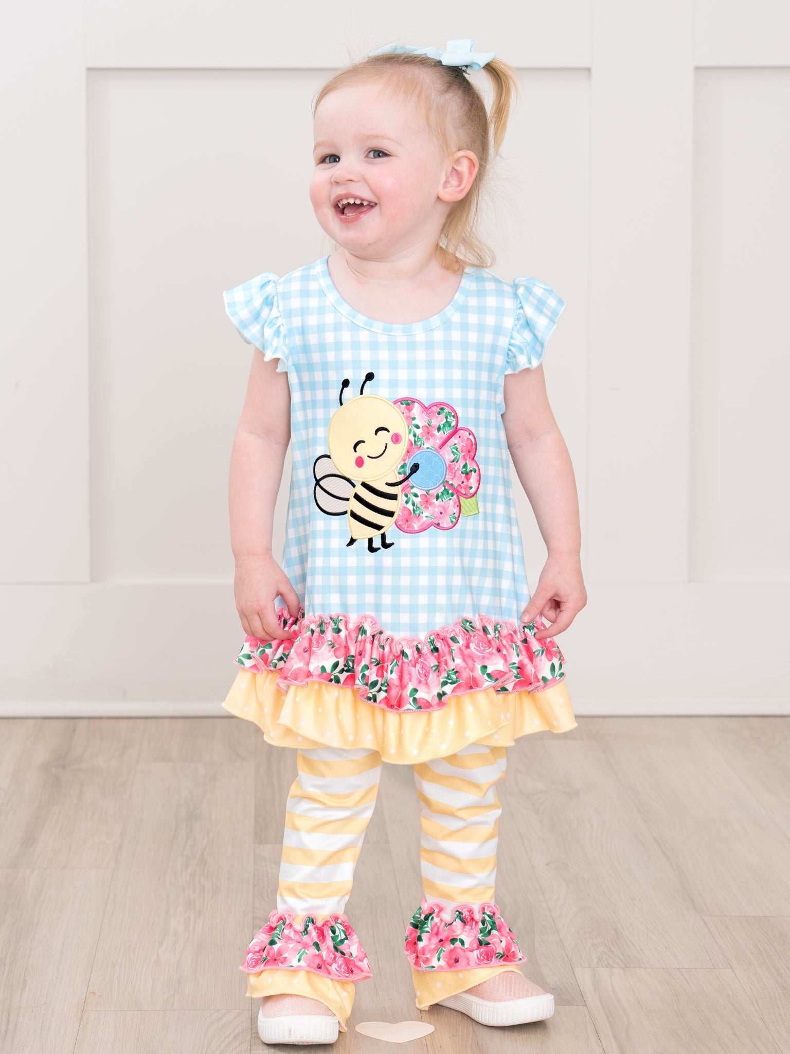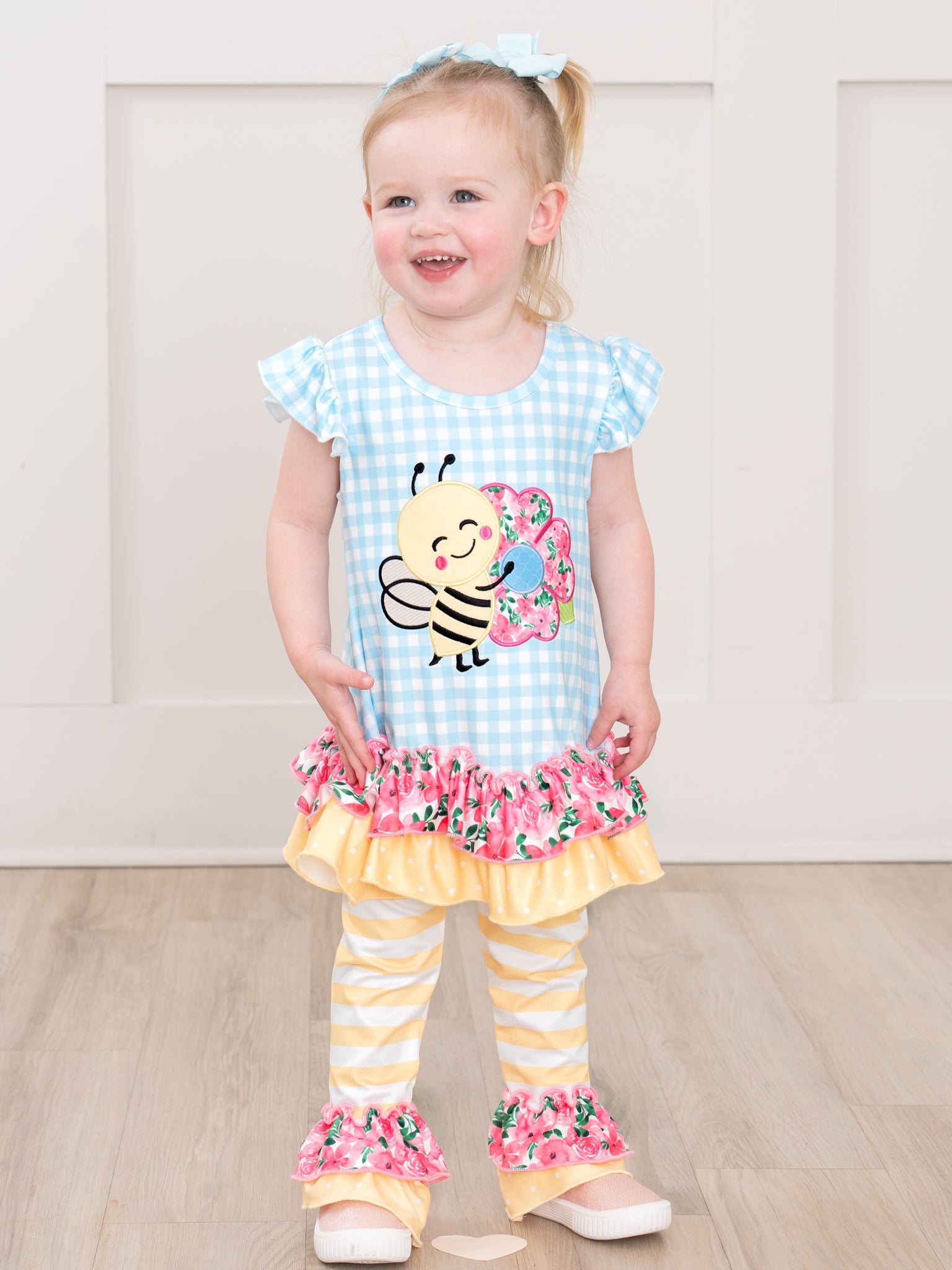 Buzz into spring with our Sweet Bee Embroidered Ruffle Outfit! This girls' set by Marie Nicole Clothing features a gingham top with an adorable embroidered bee and flower design, and a mixed print ruffle skirt. The yellow striped leggings with ruffle ankles complete the look. Don't miss out on this sweet and stylish outfit!
