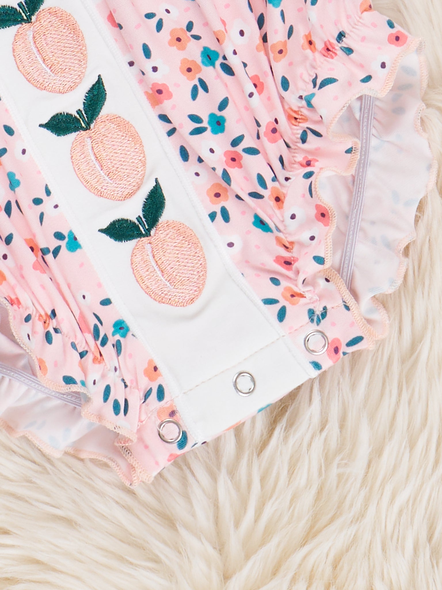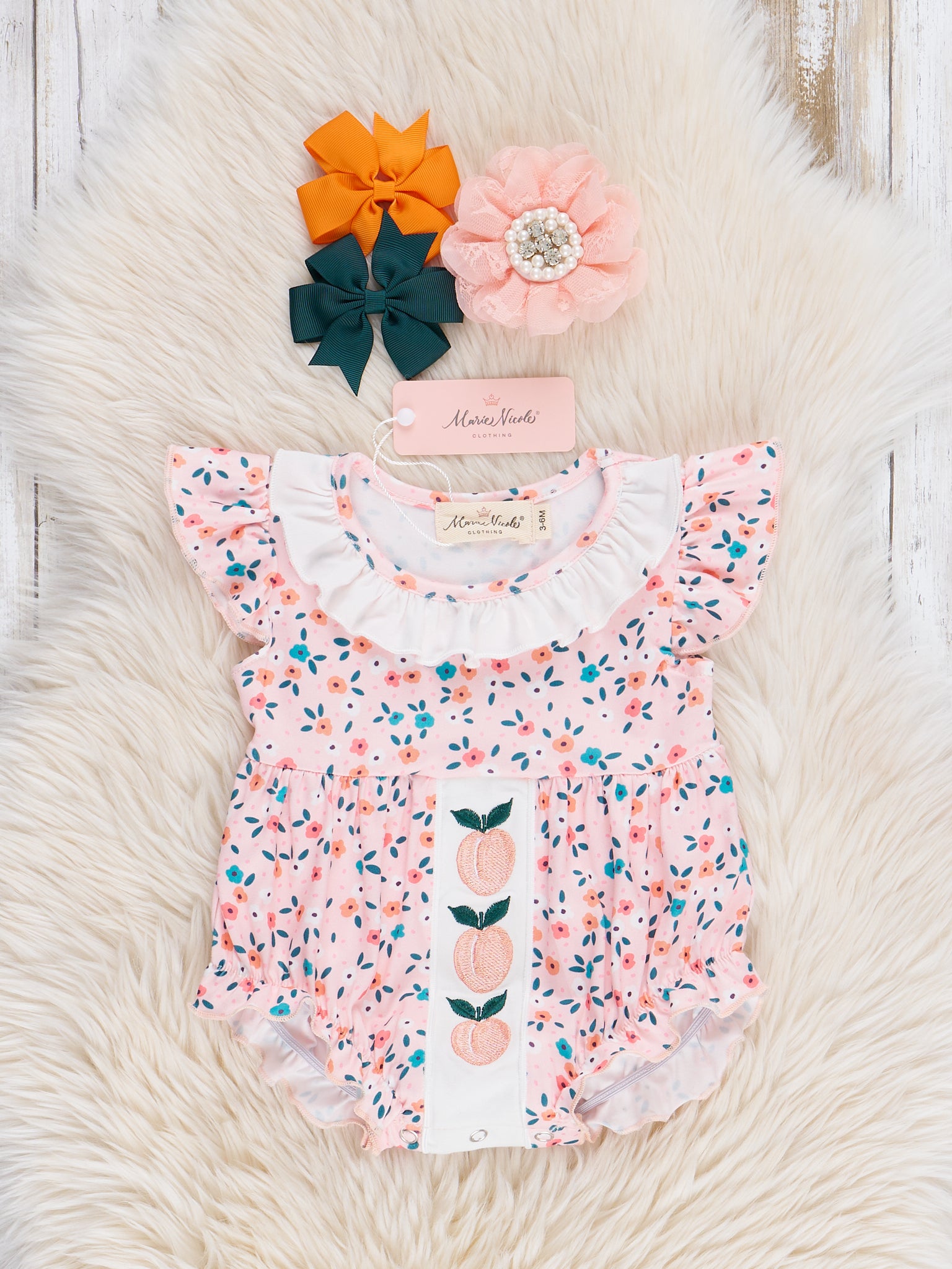 Introducing the Sweet Peach Embroidered Ruffle Bubble by Marie Nicole Clothing! This adorable girls bubble is perfect for summer with its playful floral print and charming ruffle collar. And let's not forget the cute embroidered peaches detail that adds a unique touch. Get ready for sister set cuteness overload!