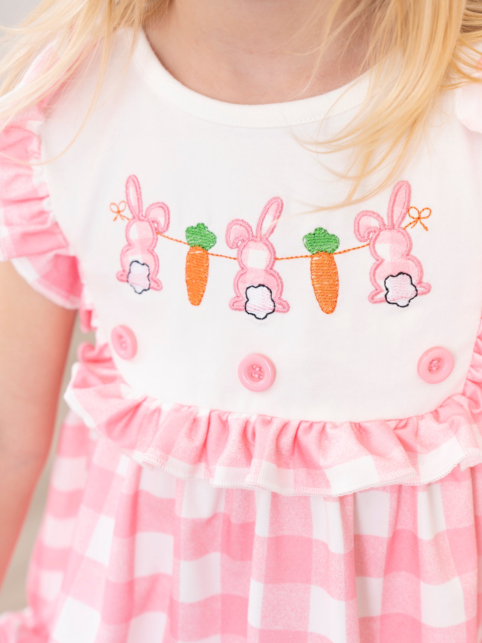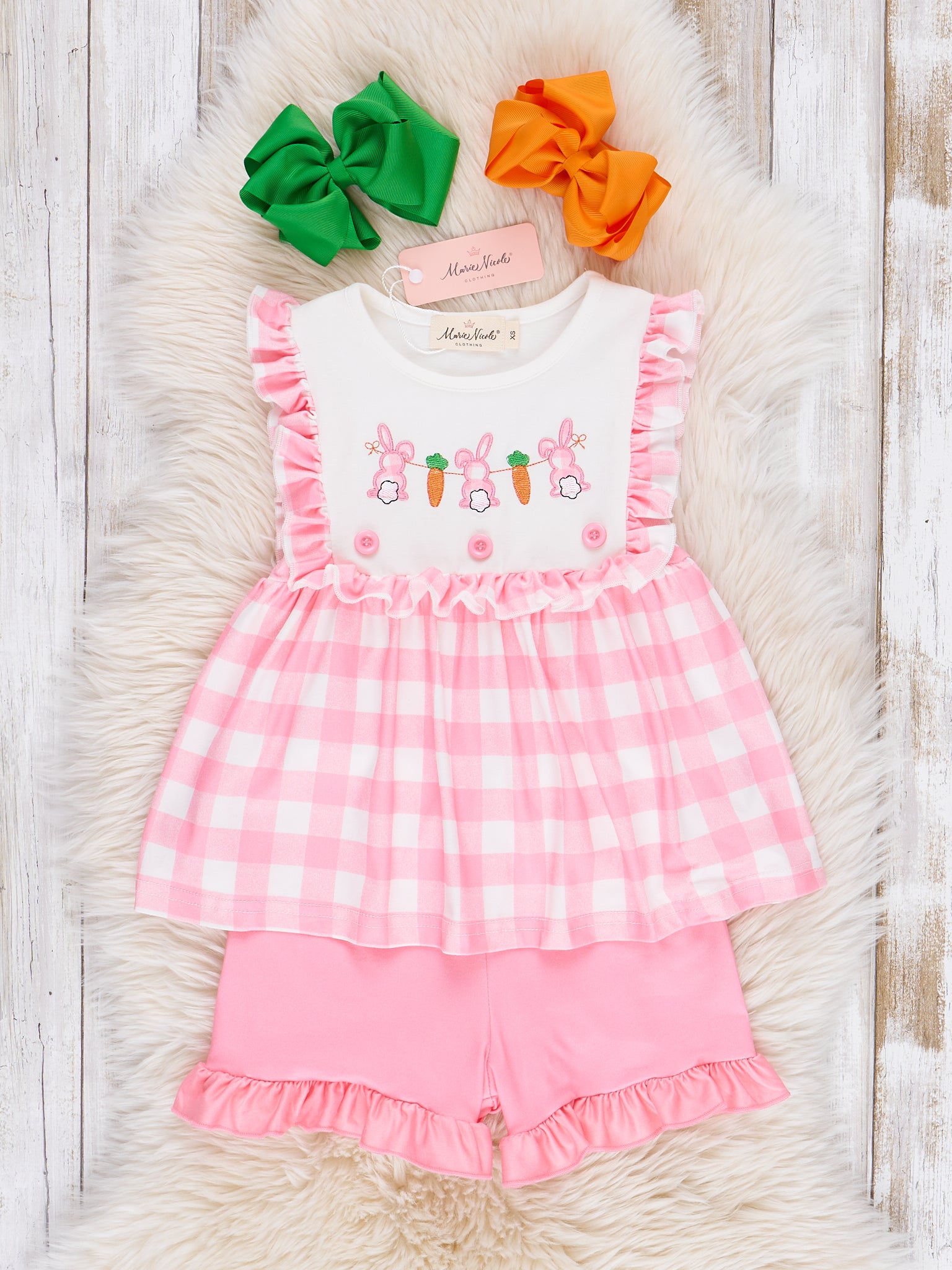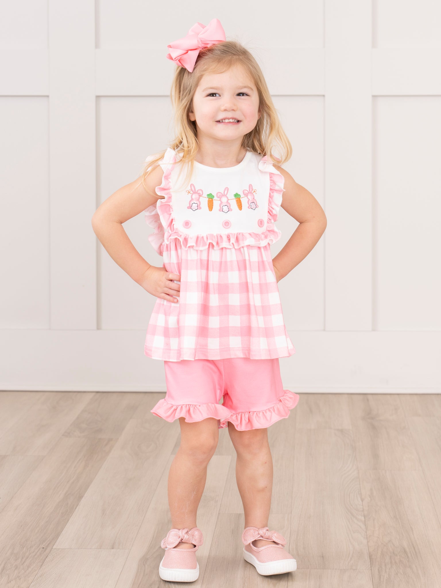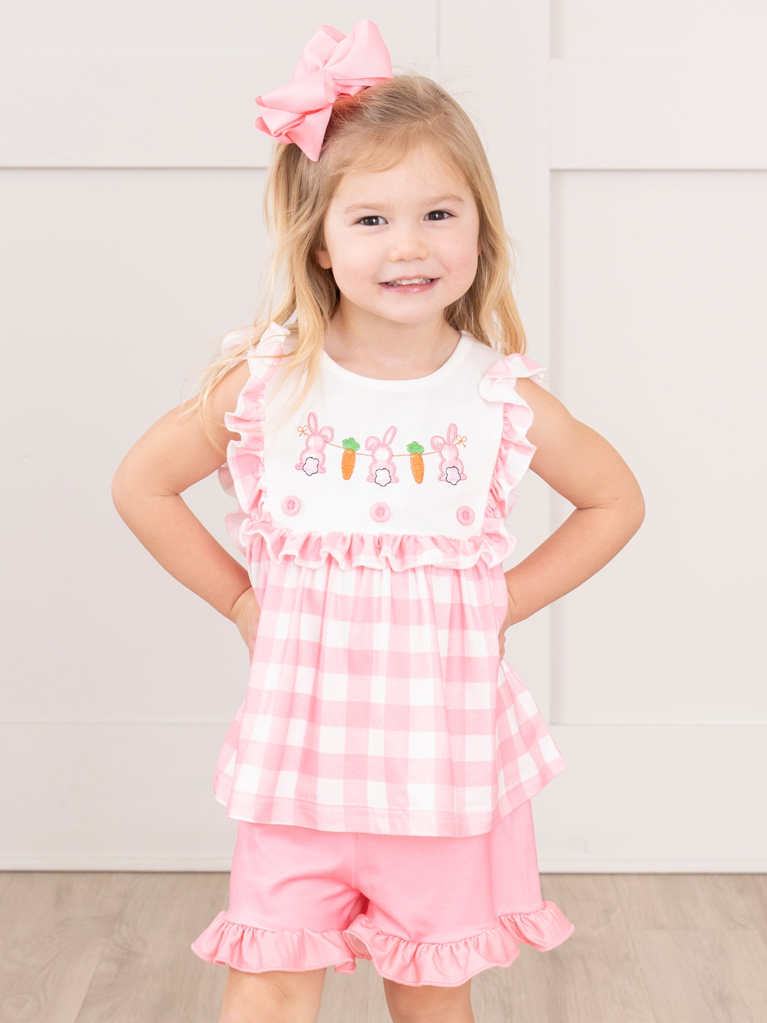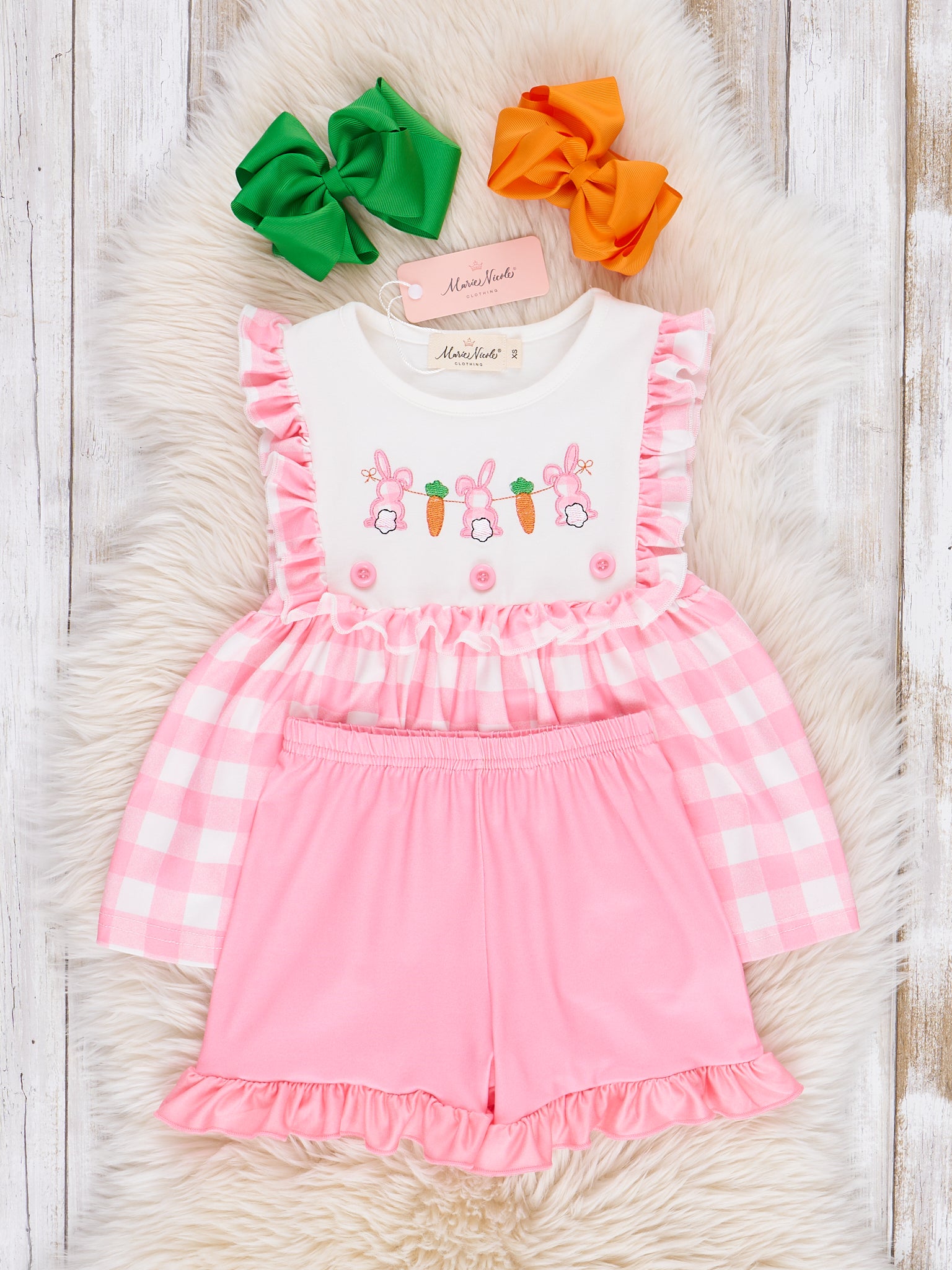 Your sweet bunnies will feel pretty in pink in this sister set by Marie Nicole Clothing! This sweet pink outfit features gingham, decorative buttons, a bib collar, embroidered bunnies with carrots, ruffles, & pink ruffle shorts with an elastic waistband.