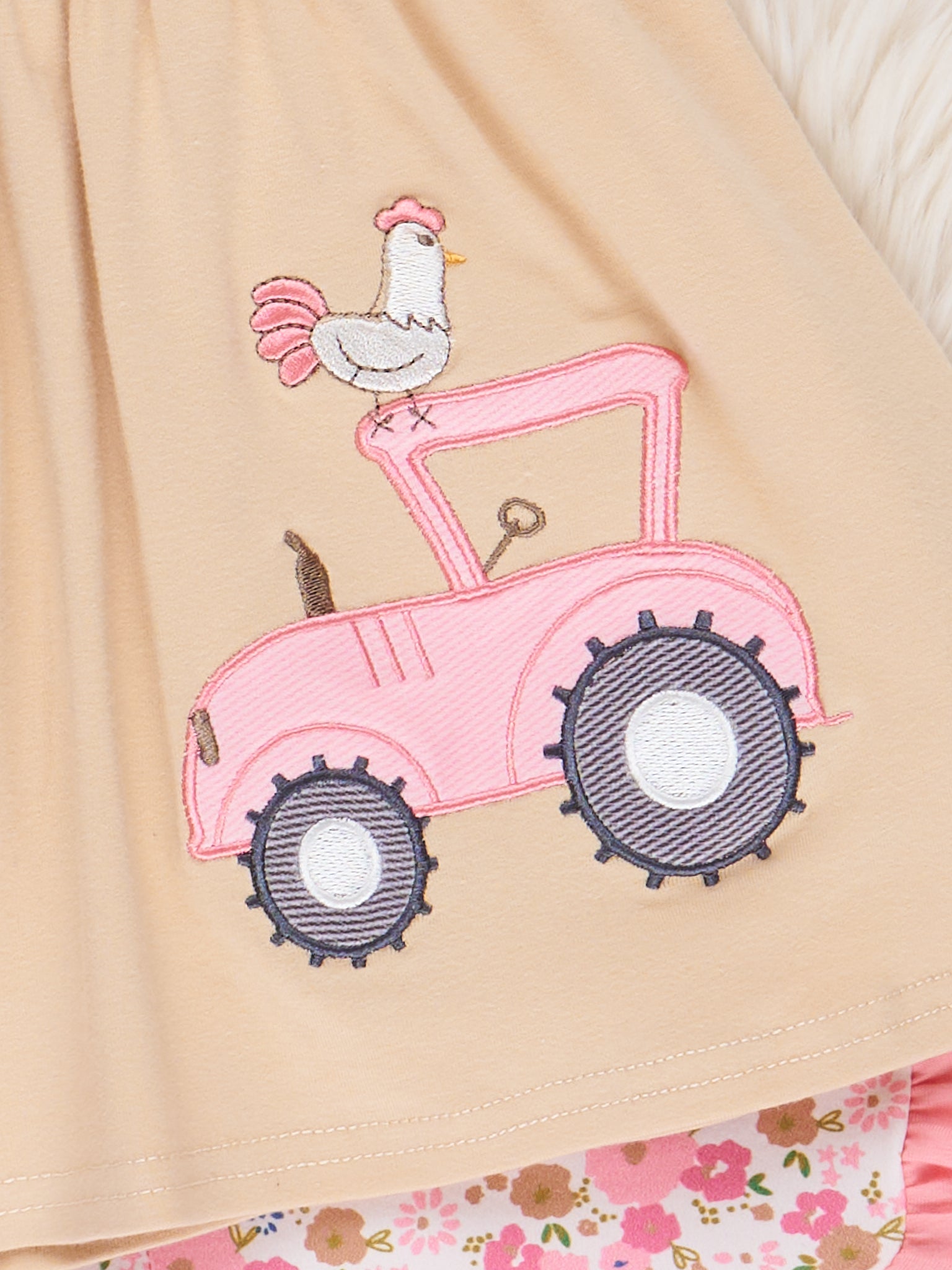Get your little one ready for some farm fun with the Sweet Tractor Ride Floral Ruffle Outfit by Marie Nicole Clothing! This adorable girls shorts set features a tan top and playful ruffle detail. But the real showstopper? An embroidered chicken riding a tractor on the top paired with the floral ruffle shorts. Perfect for a sister set, this dress is as unique as it is charming.