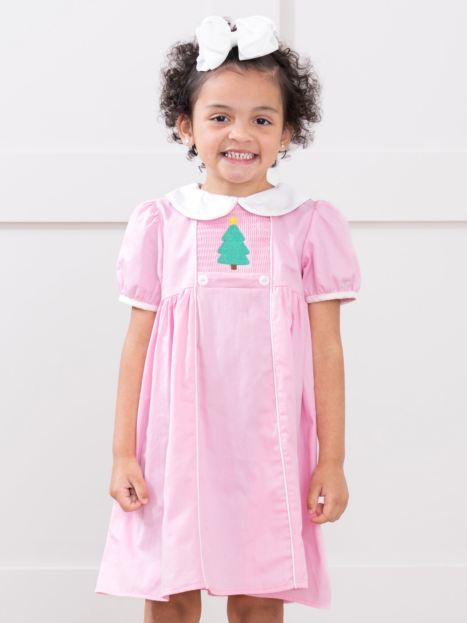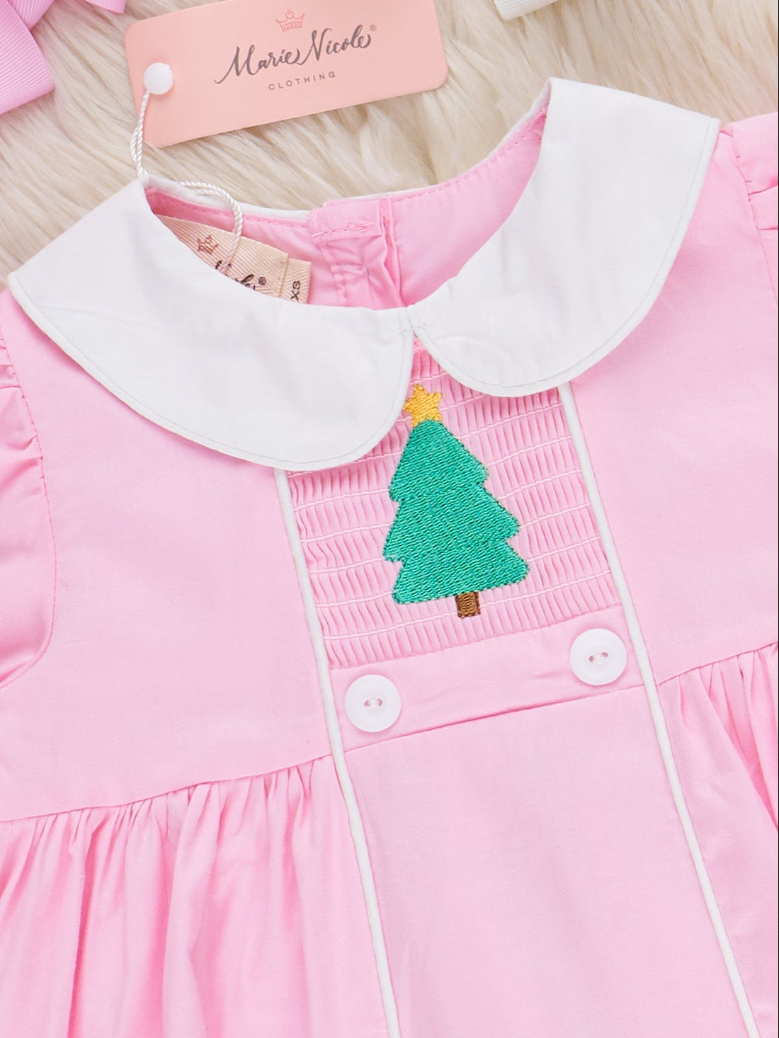 The Tall Jolly Tree Embroidered Poplin Dress by Marie Nicole Clothing is a classic holiday dress in soft pink, featuring a crisp white Peter Pan collar, piped details, and a festive green Christmas tree applique at the neckline. Designed for timeless seasonal charm, this 100% cotton dress is perfect for holiday gatherings, photos, and creating special memories.