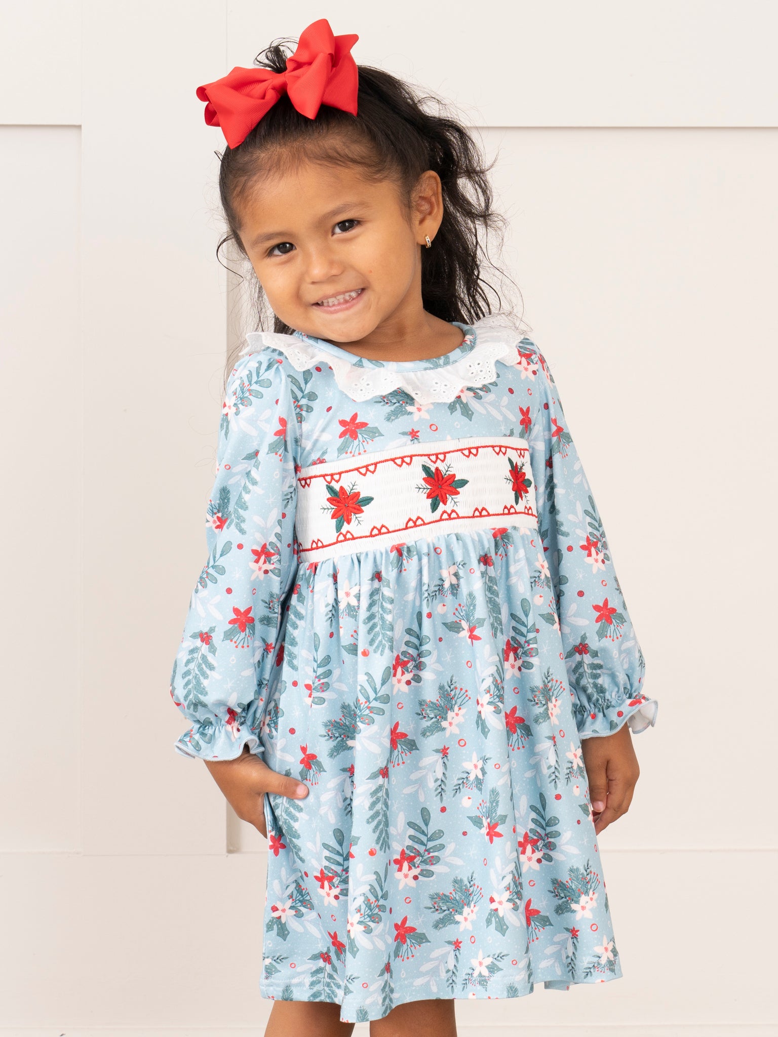 Get festive with this teal smocked dress for girls! Featuring a unique poinsettia print bodice and delicate embroidered poinsettia flowers over smocking, this dress is perfect for celebrating the season. The lace collar adds an extra special touch. Also available as part of a sister set.