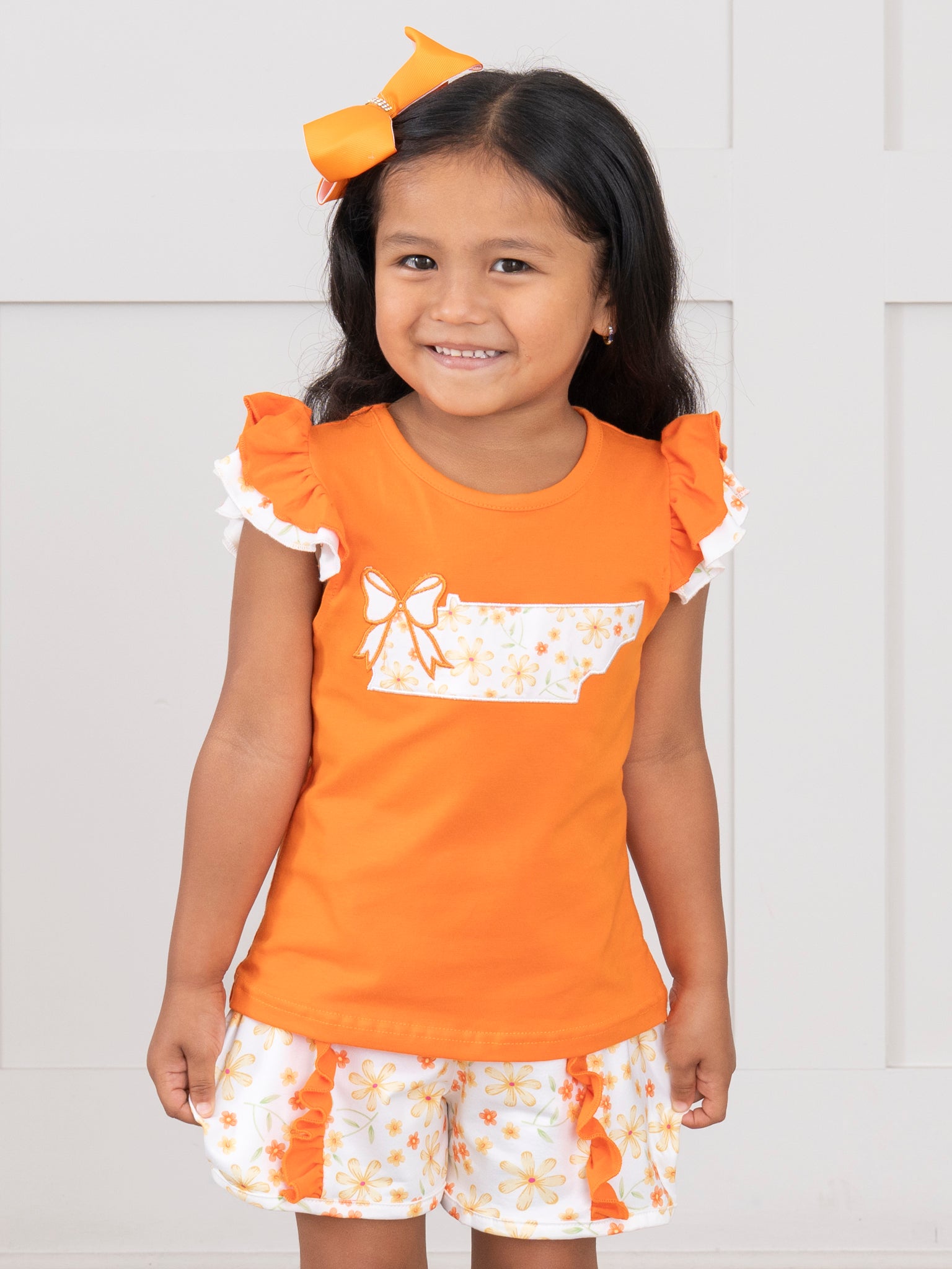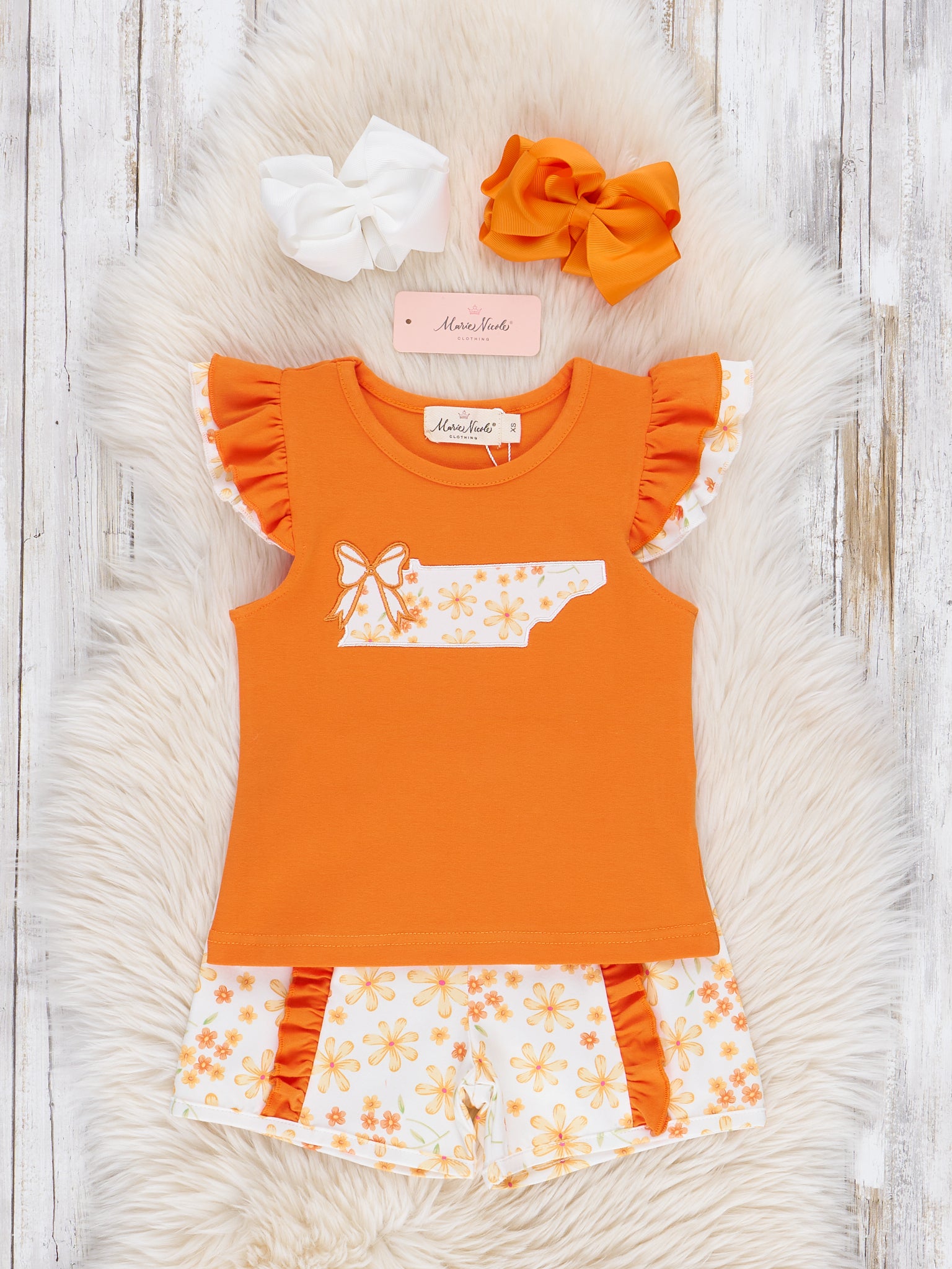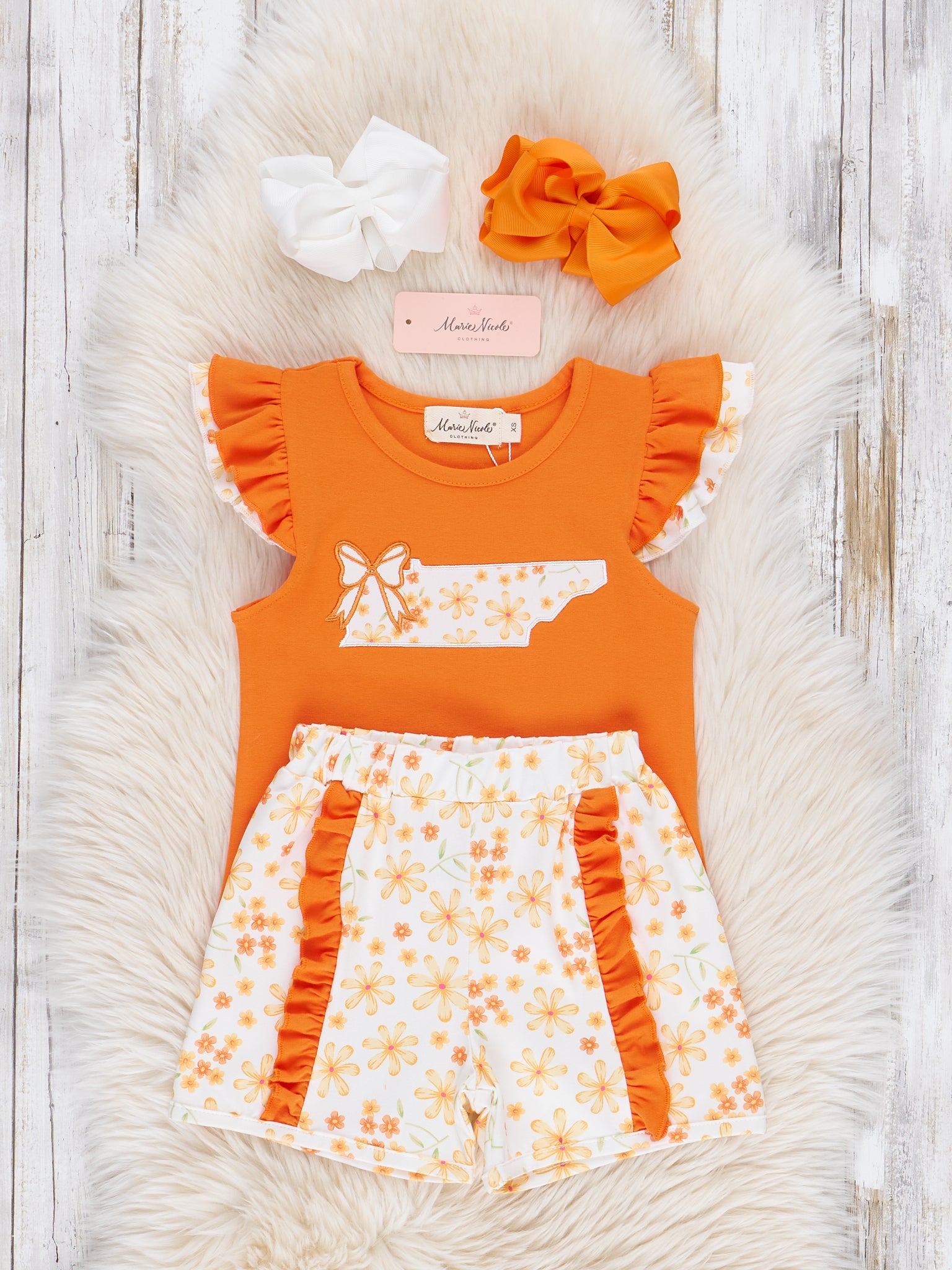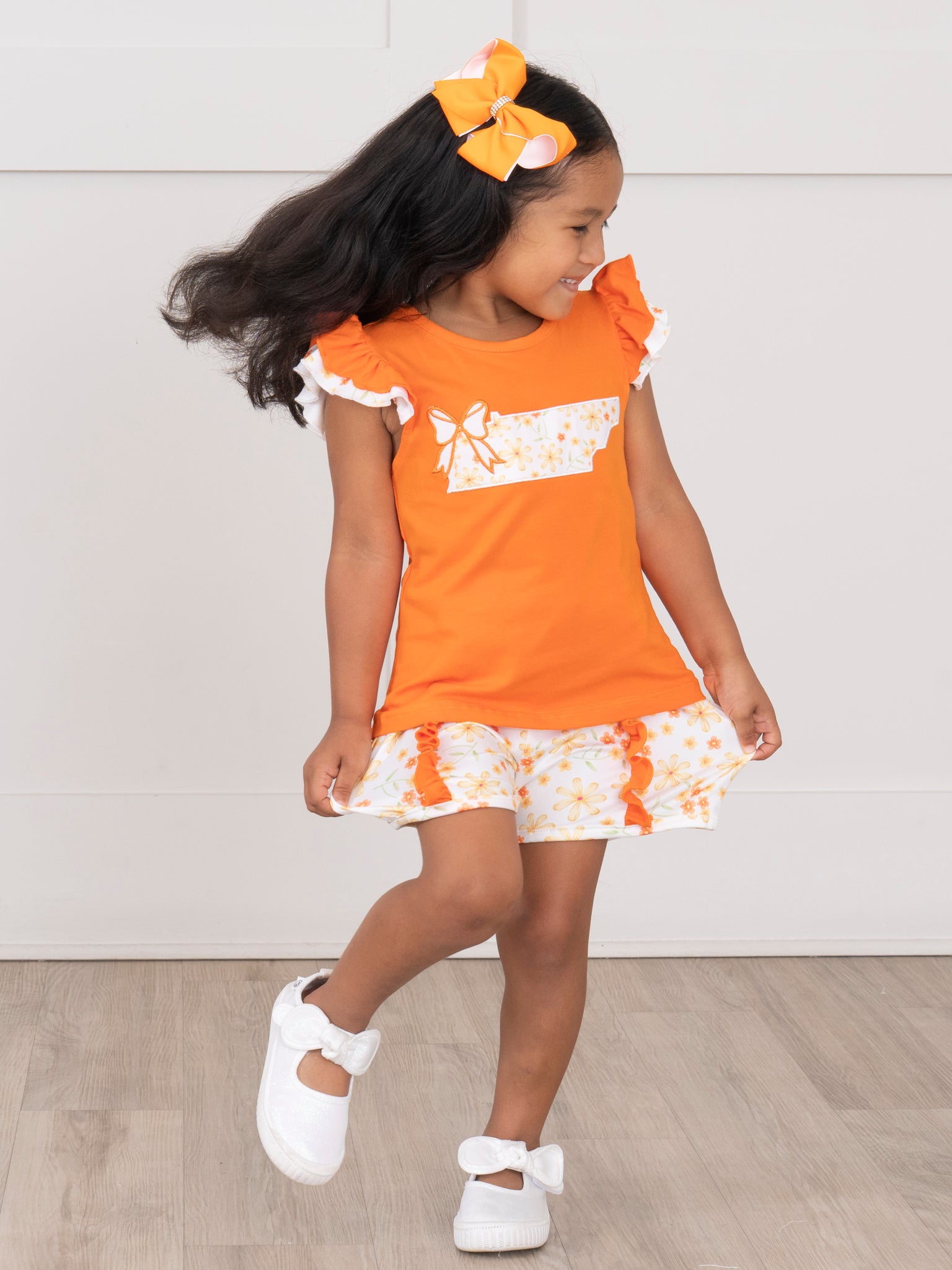 The Tennessee Embroidered Floral Ruffle Outfit is a bright and playful set that’s perfect for sunny days and sweet adventures. Featuring a bold orange top with ruffled floral sleeves and a charming Tennessee applique, this outfit from Marie Nicole Clothing is ideal for warm weather, family outings, or cheering on your favorite team in style—perfect for game day spirit!