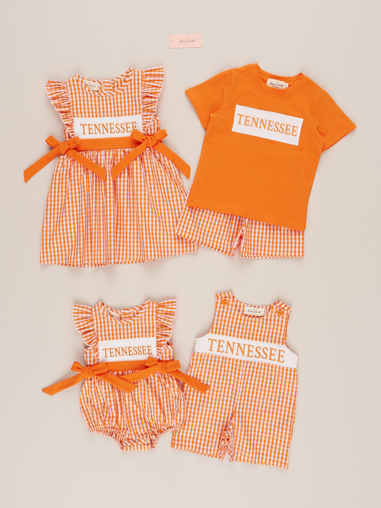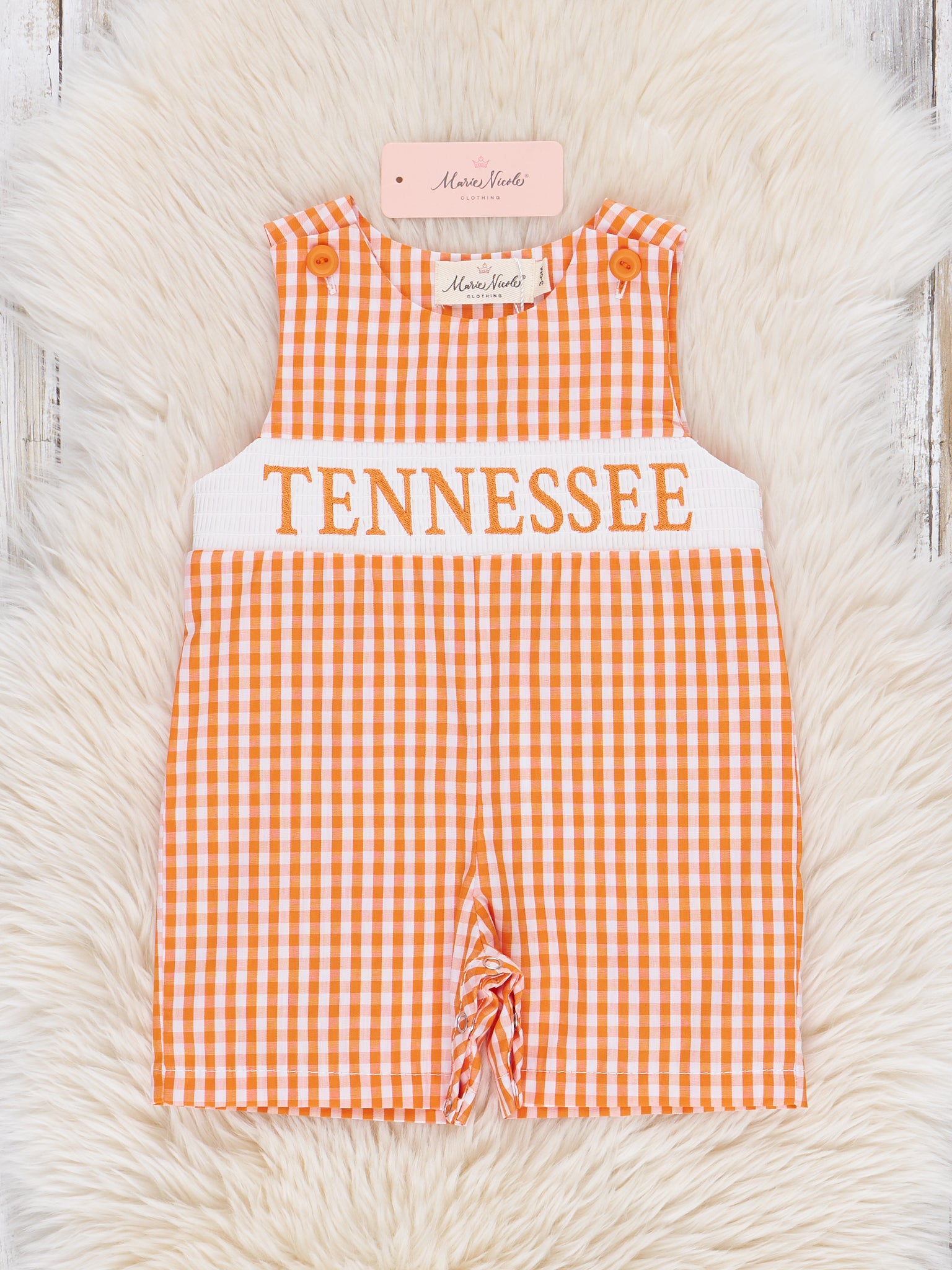 The Tennessee Smocked Gingham Johnny is a classic and charming choice for your little guy to show off his state pride. Featuring a timeless orange and white gingham print and a smocked panel with bold “Tennessee” embroidery, this one-piece from Marie Nicole Clothing brings Southern style to game day and beyond. Lightweight, breathable, and designed with convenient snaps for easy changes, it’s a spirited outfit perfect for tailgates, family photos, or sunny adventures.