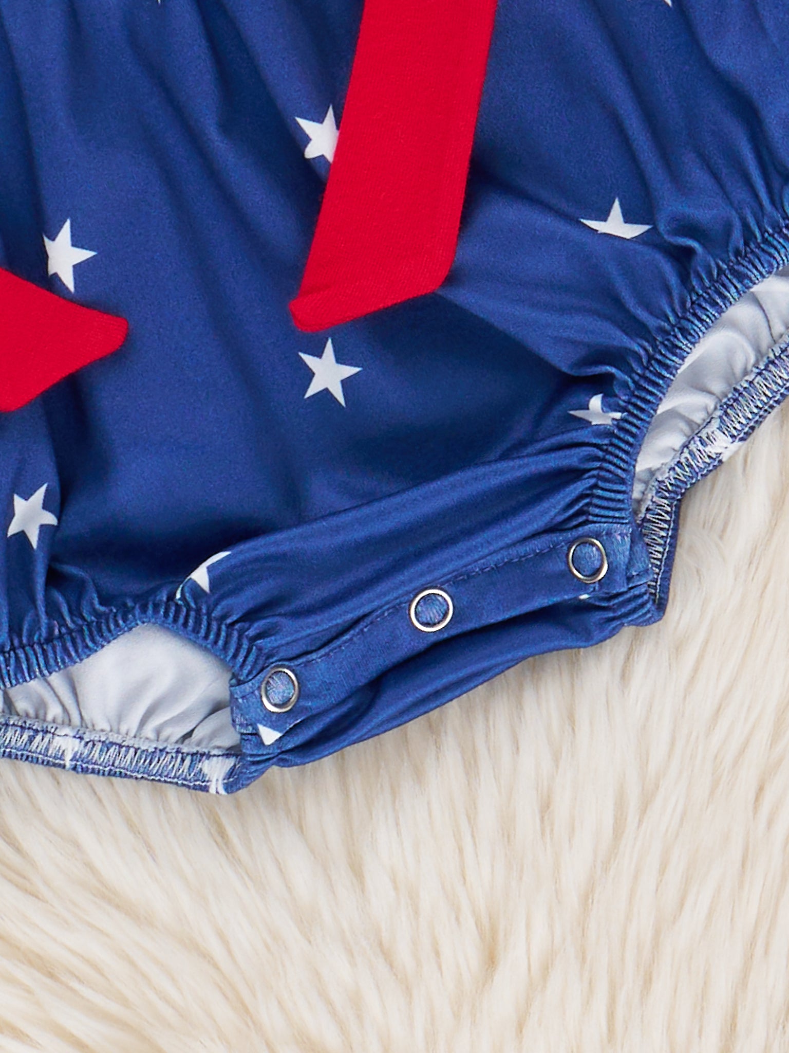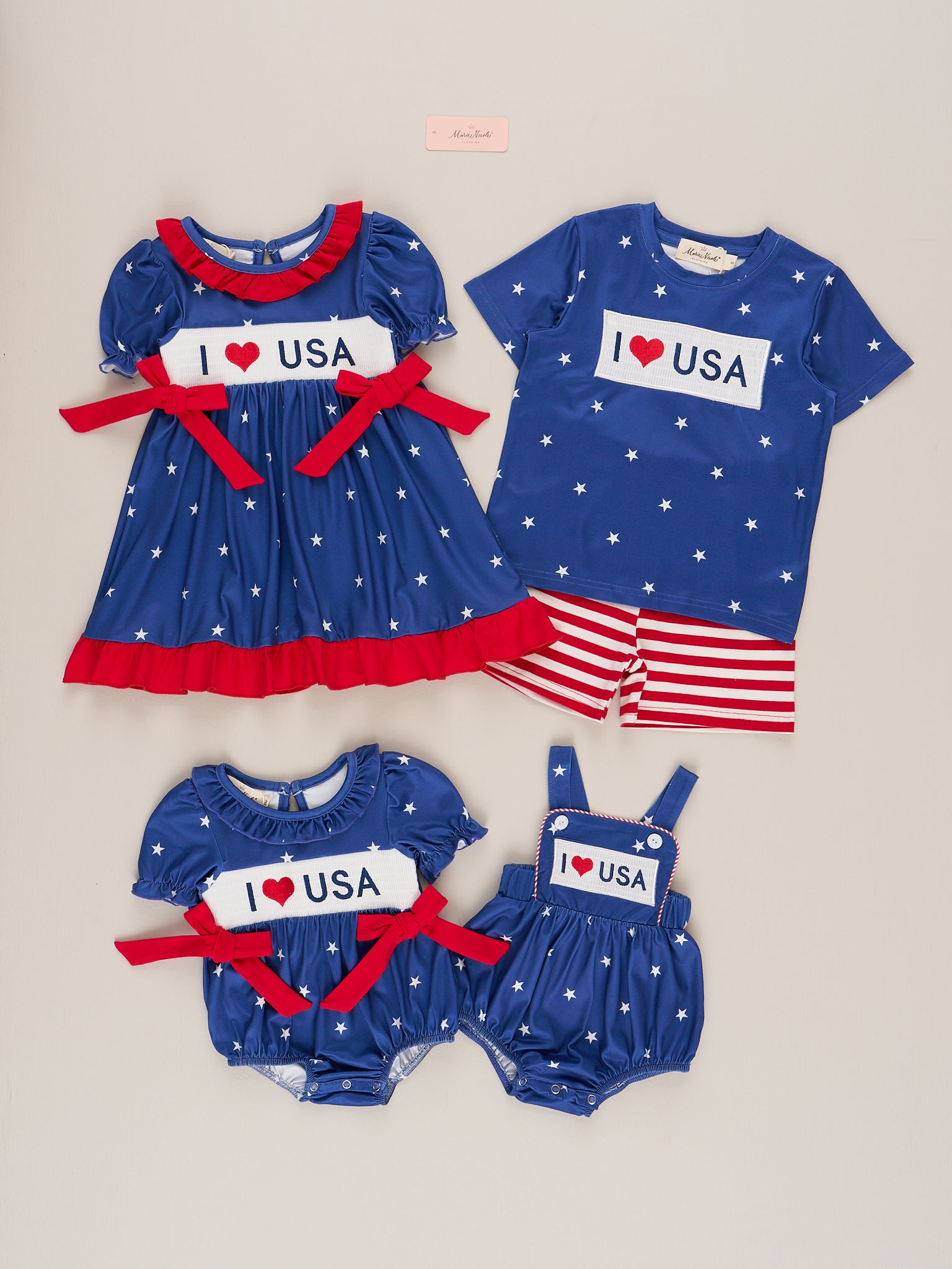 Celebrate Independence Day in style with our USA Love Smocked Bow Bubble! This adorable girls' buble features an embroidered "I ❤️ USA" design over smocking, blue star print, and red ruffles and bows, perfect for a patriotic look. Complete the look with our coordinating sibling set from Marie Nicole Clothing.