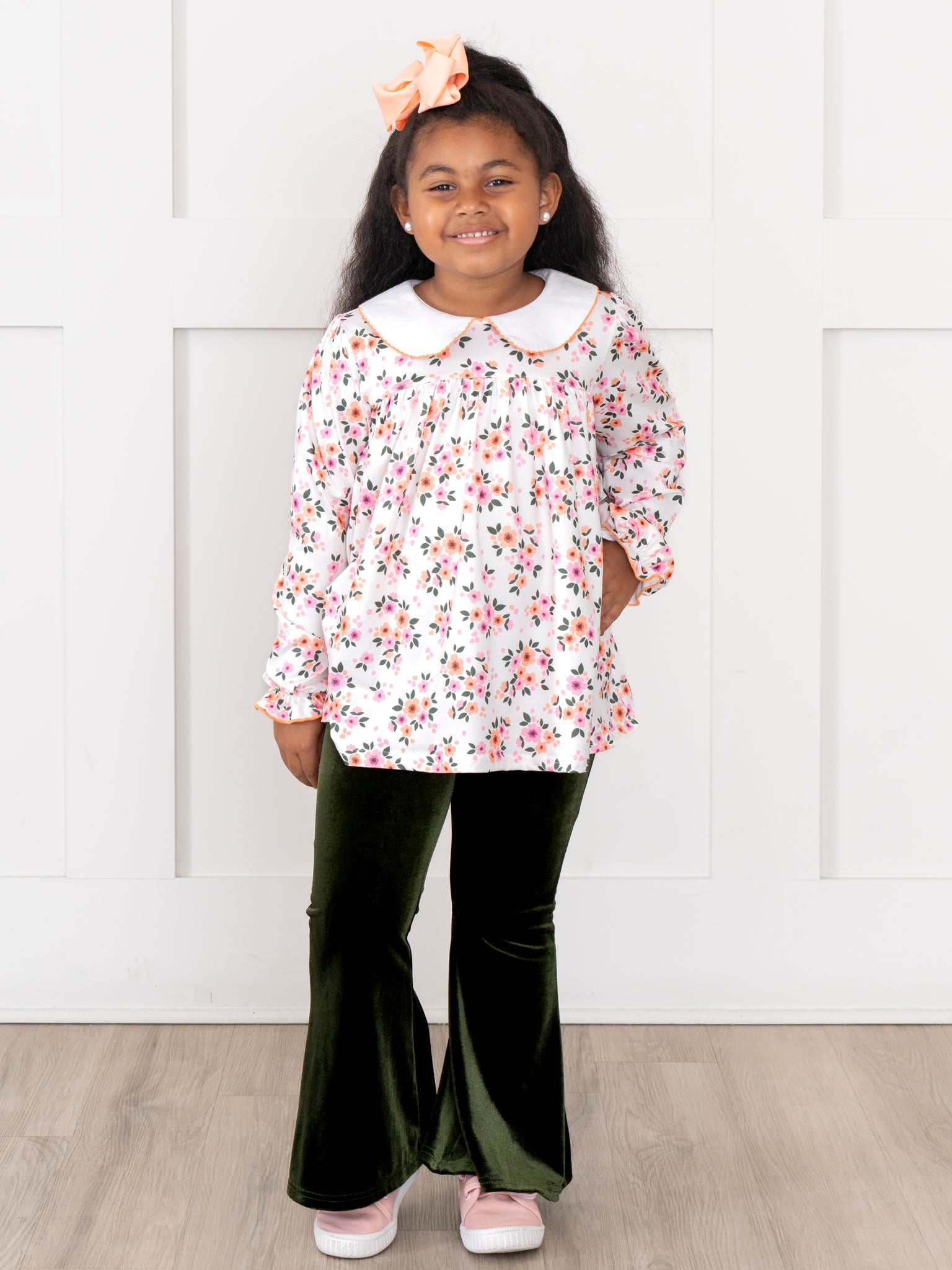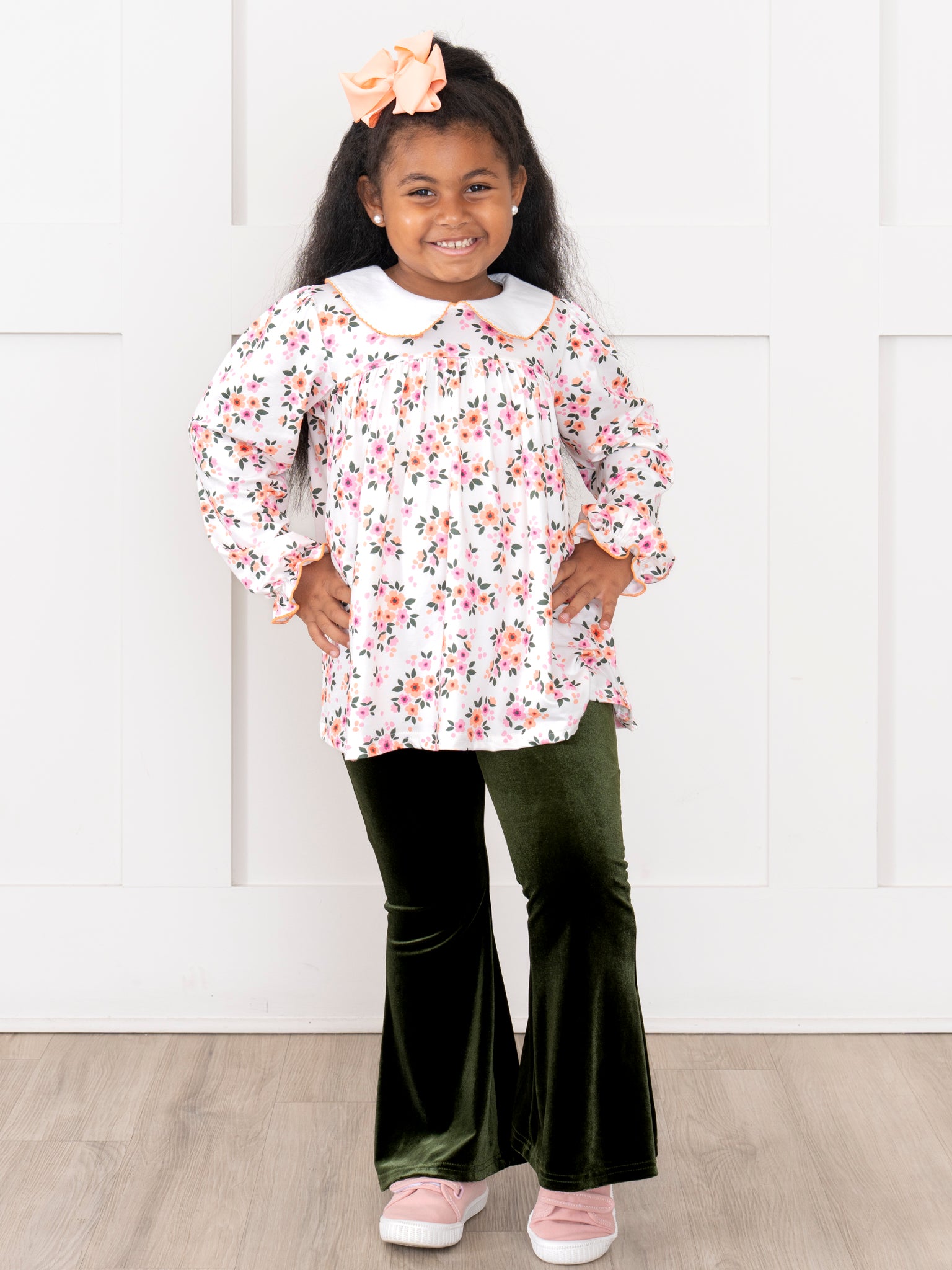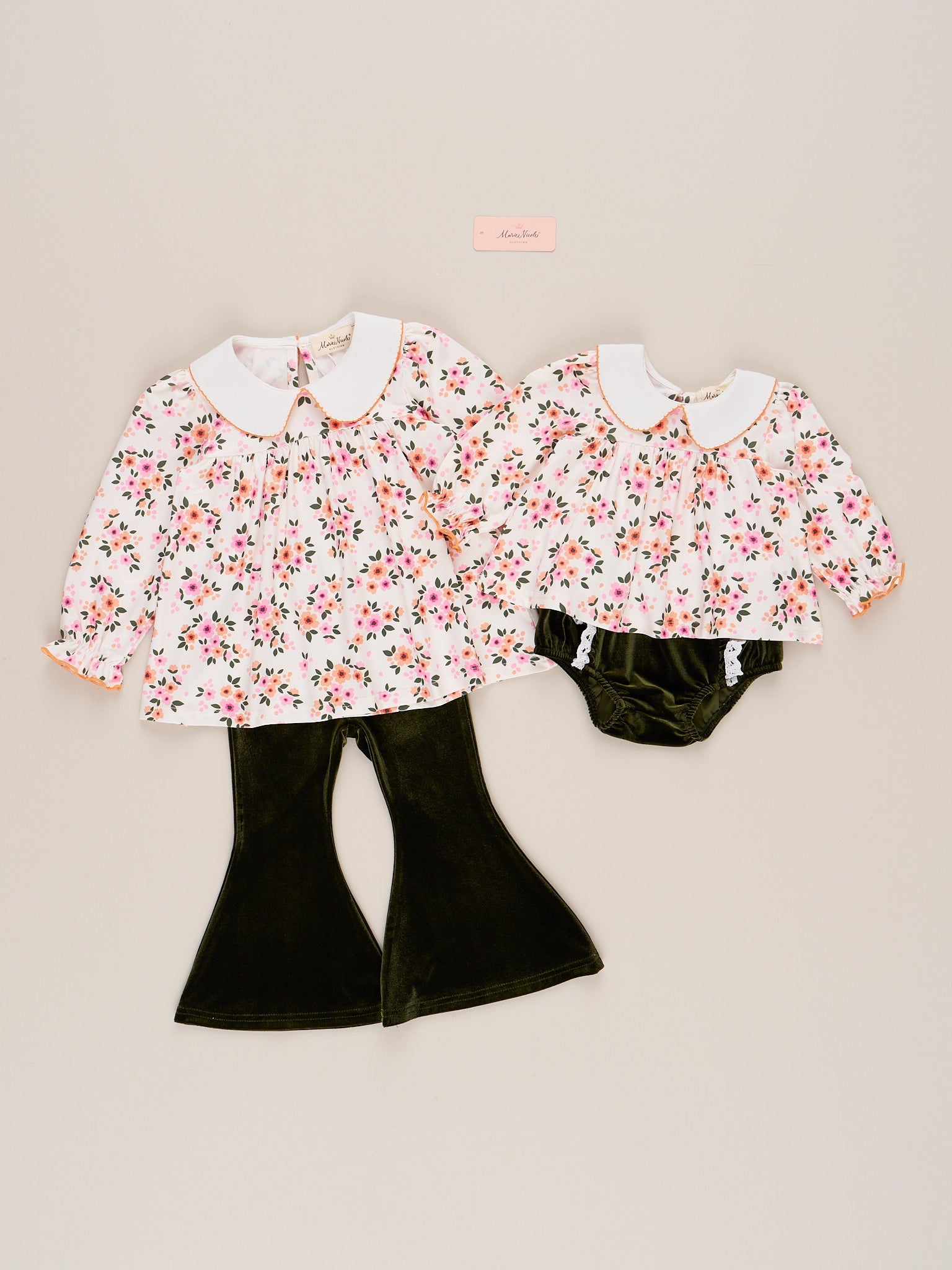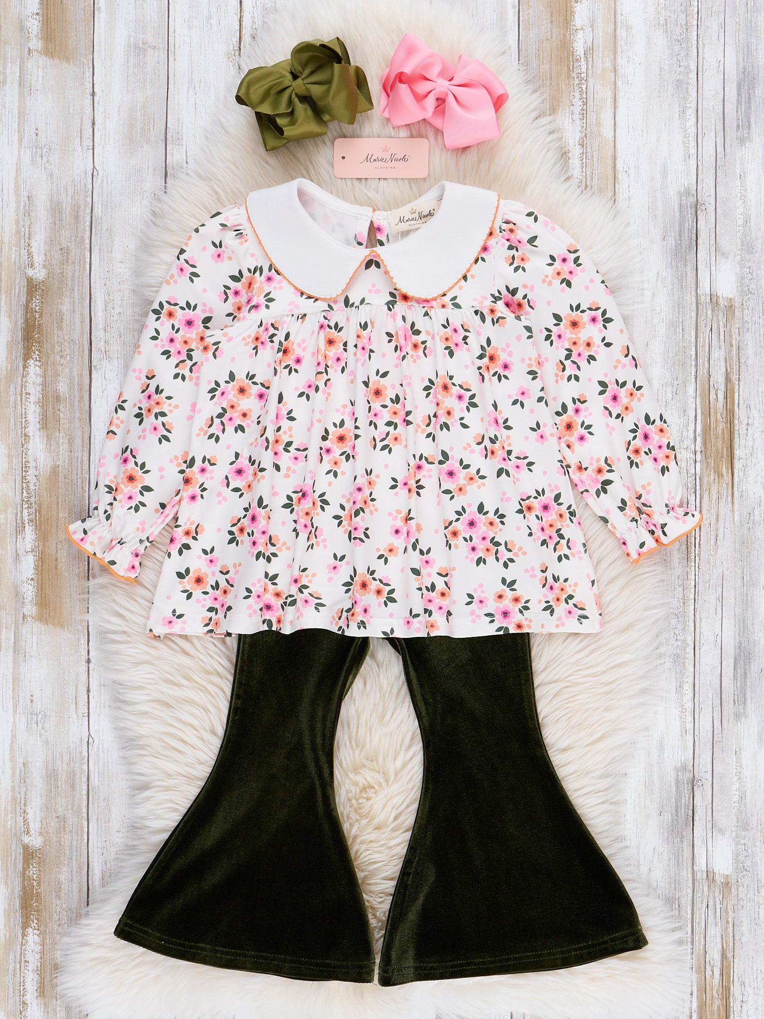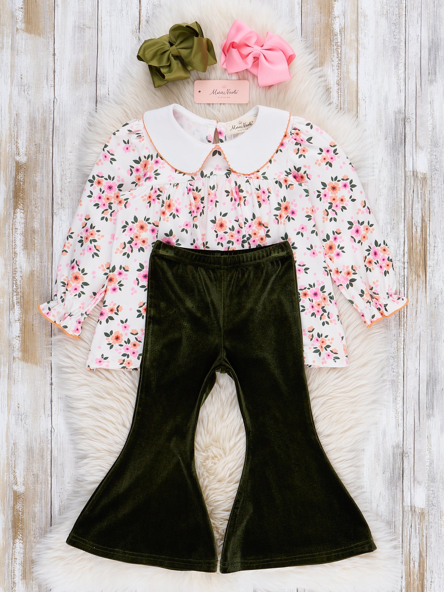 The Velvet Blossom Floral Outfit is a sweet and sophisticated style, perfect for cozy fall days and picture-perfect moments. Featuring a charming floral top with delicate ruffle details and paired with soft velvet bell bottom pants, this outfit from Marie Nicole Clothing blends seasonal elegance with playful comfort. Ideal for special occasions, family gatherings, or simply blooming in style.