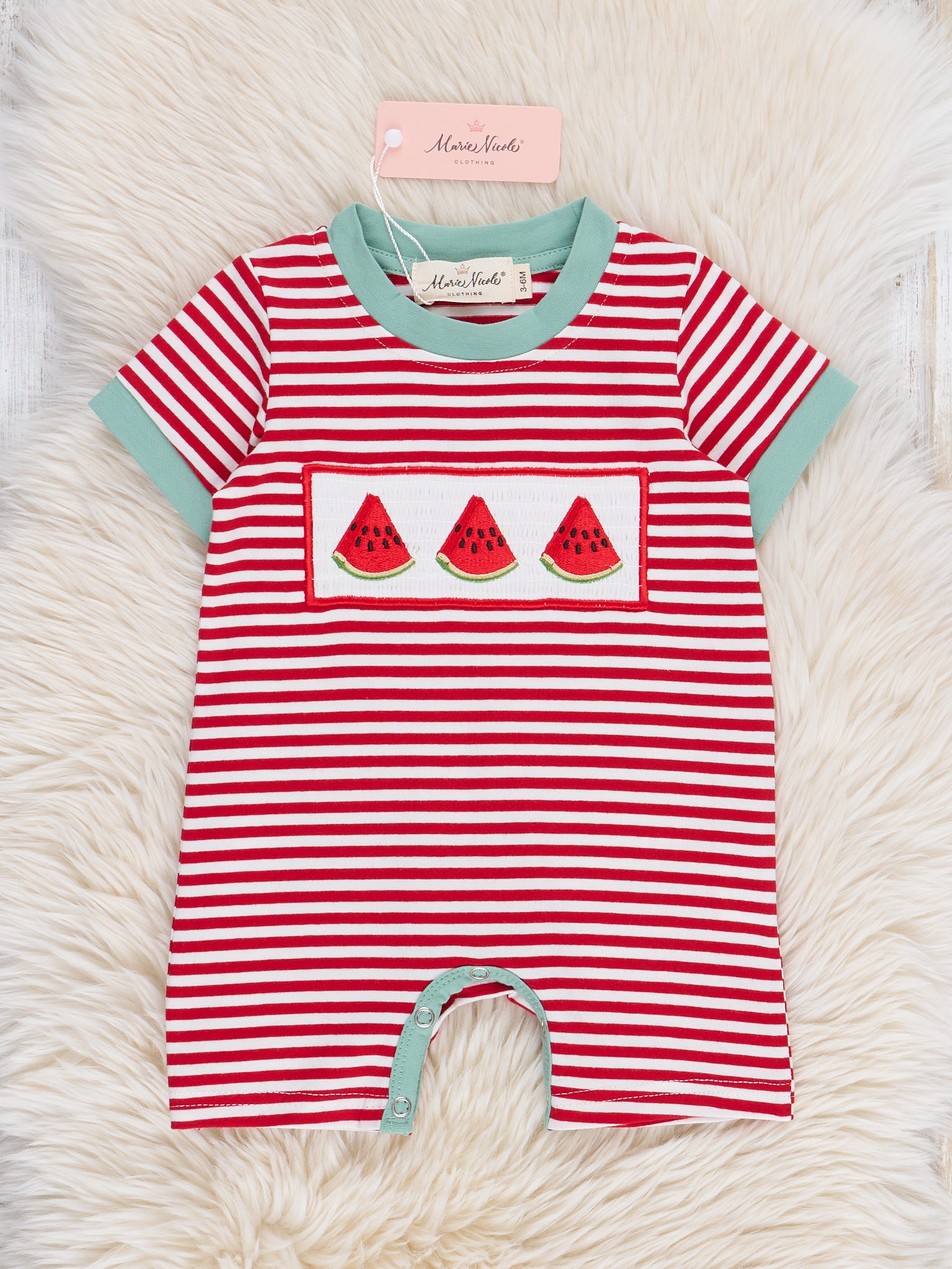 Unleash some serious summertime cuteness with this sibling set by Marie Nicole Clothing! Featuring playful stripes with fresh trim, and cute embroidered watermelon over smocking, this Watermelon Stripes Smocked Cotton Romper is perfect for your little one's summer adventures. Hurry and grab this juicy piece while it lasts!