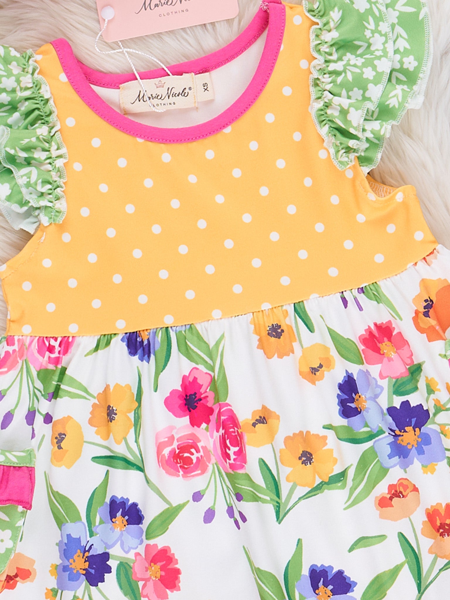 Get ready for some serious cuteness with our Wildflowers & Polka Dots Ruffle Shorts Outfit! Made from soft and lightweight fabric, this outfit by Marie Nicole Clothing features fun ruffle hem shorts, adorable polka dots, and a charming wildflower print. Perfect for any occasion, your little one will look oh-so-adorable and feel comfortable all day long.