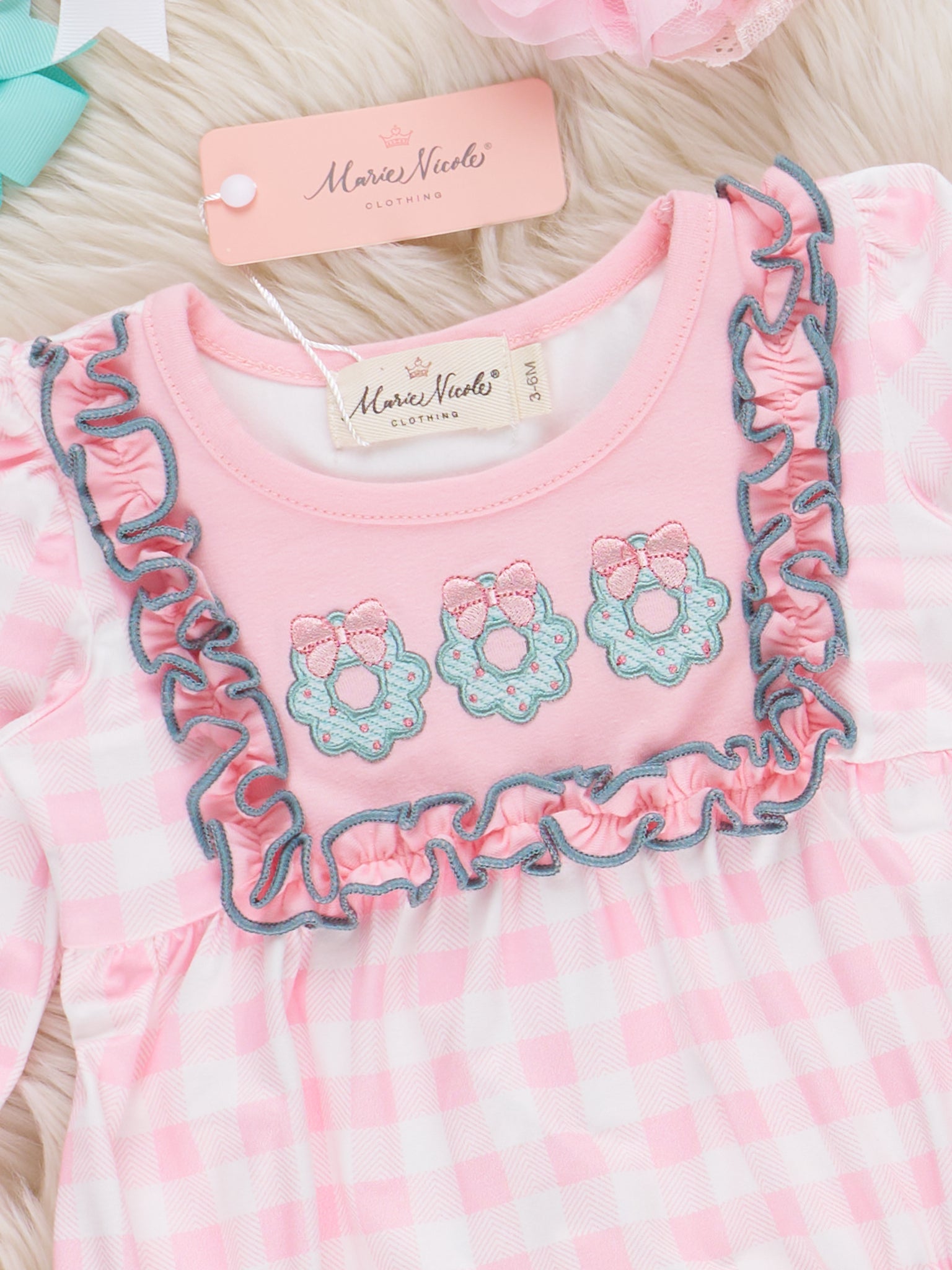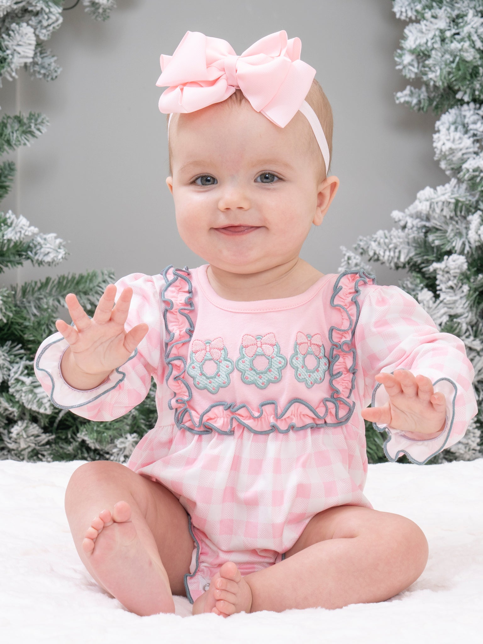 The Wreathed in Love Embroidered Ruffle Bubble Romper by Marie Nicole Clothing features a sweet pink gingham pattern with delicate floral embroidery across the bodice and soft ruffle accents. Designed with long sleeves and a comfy bubble silhouette, it’s perfect for everyday play, special occasions, and capturing charming memories for little ones.