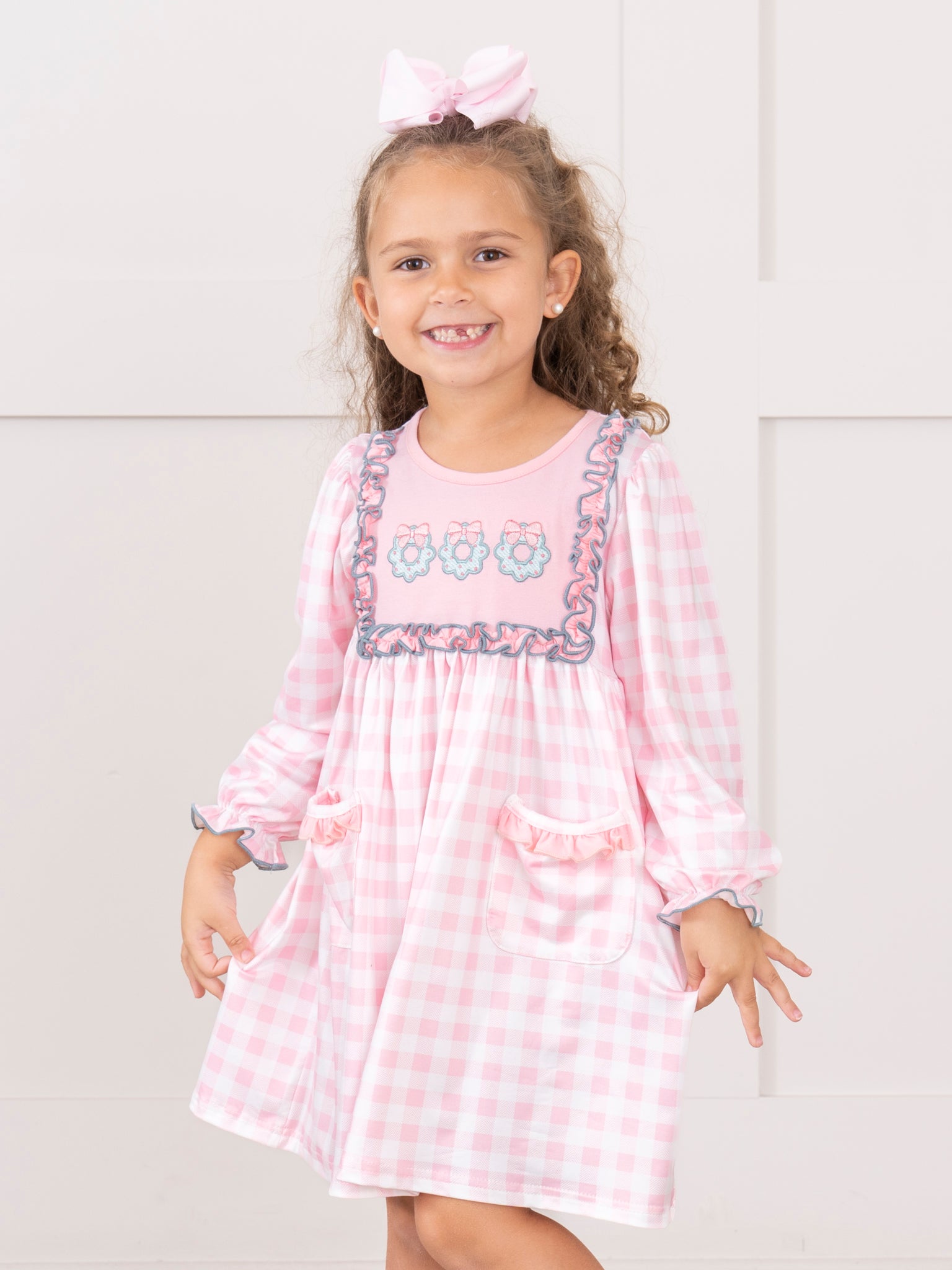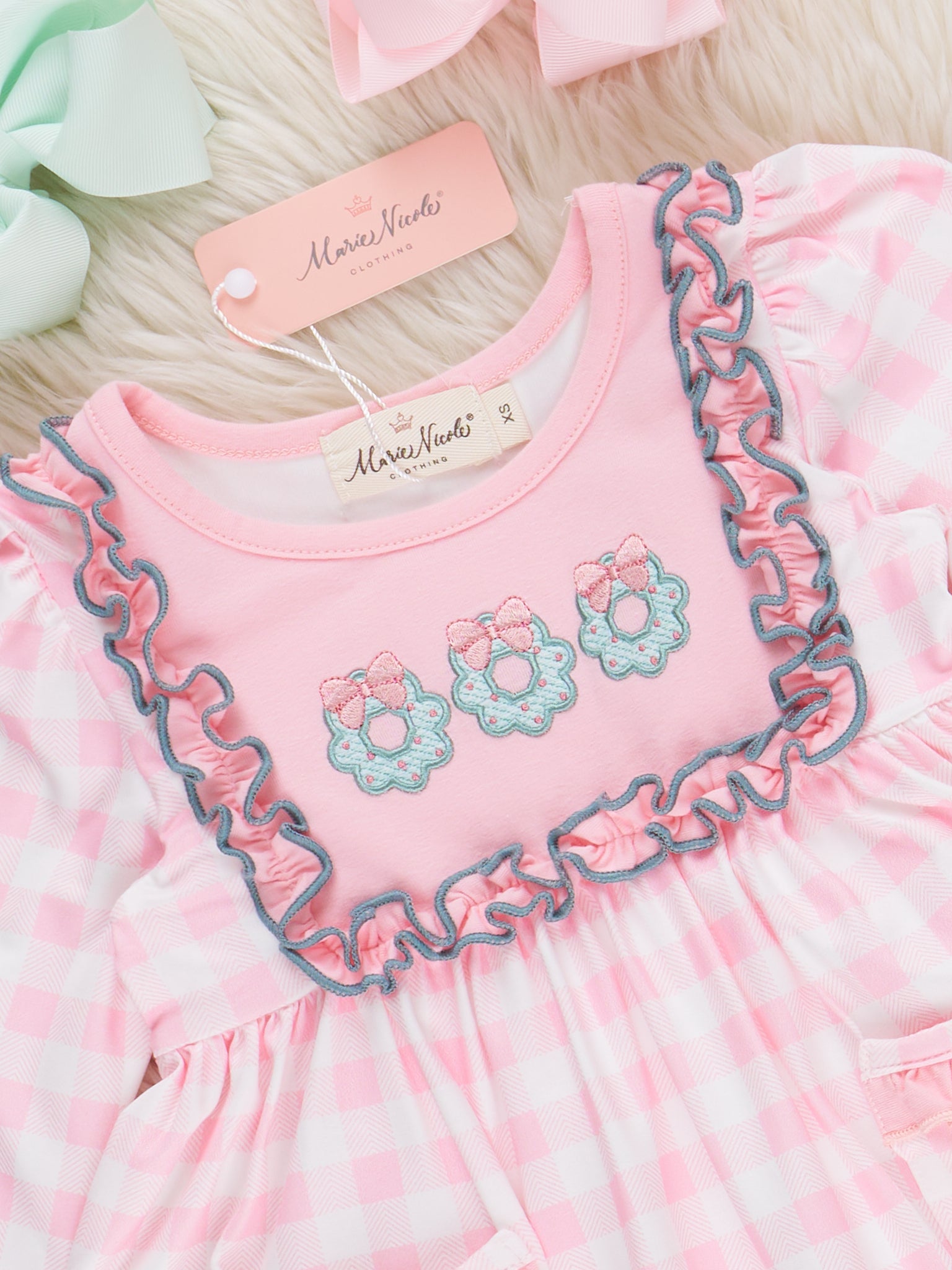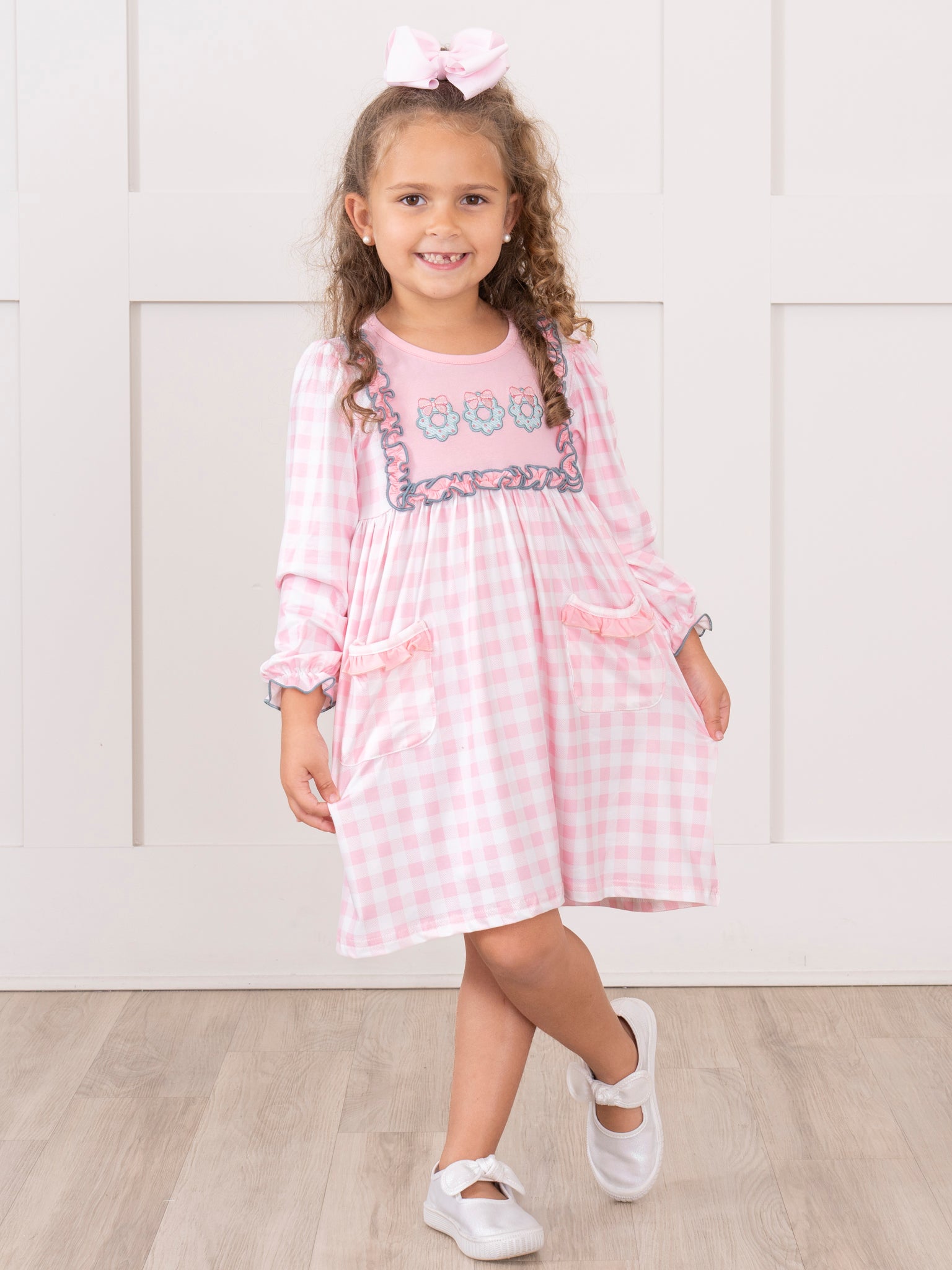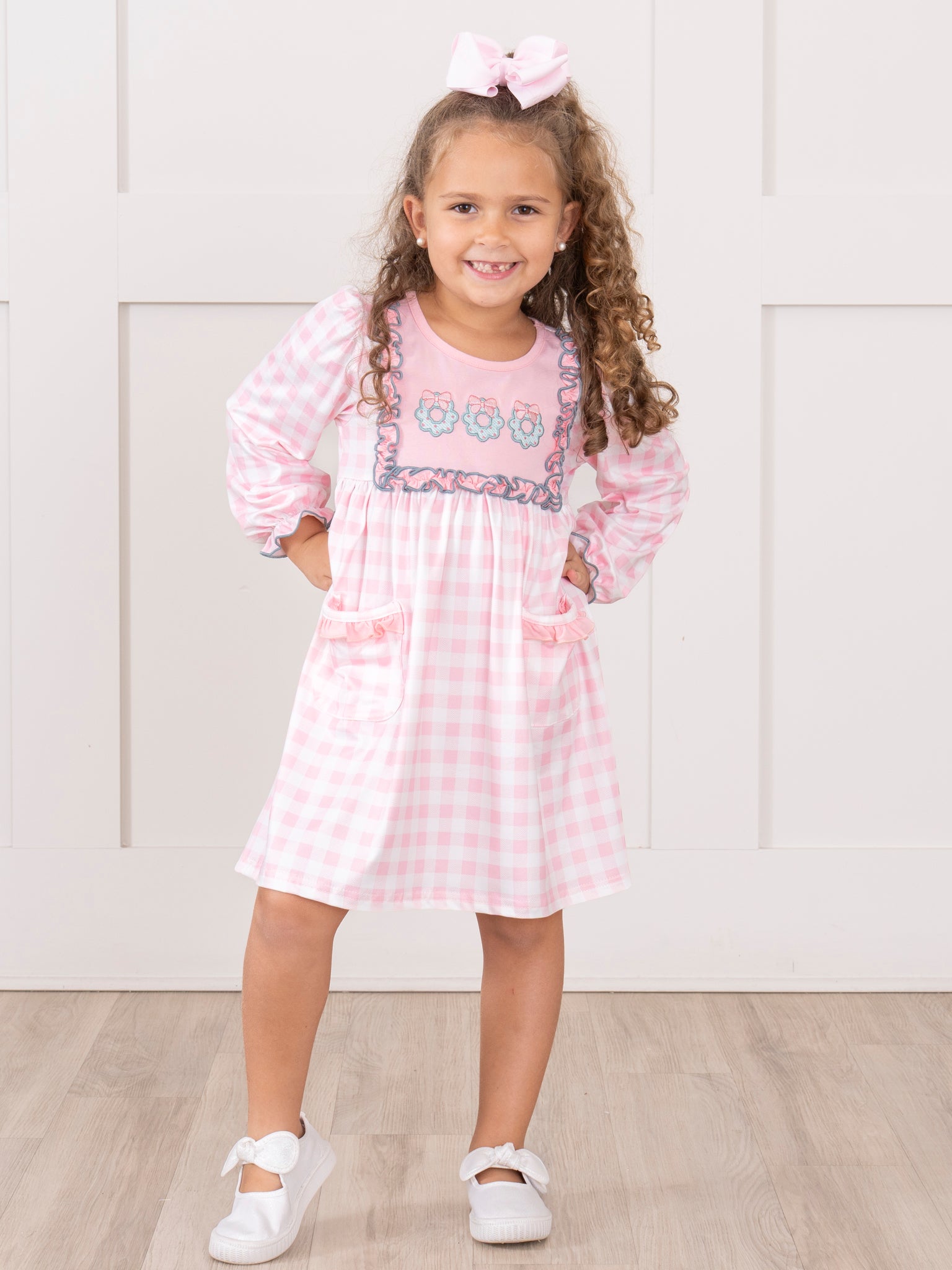 Wreathed in Love Embroidered Ruffle Dress by Marie Nicole Clothing is a charming long-sleeve dress featuring a classic pink gingham print, delicate wreath embroidery across the bodice, and sweet ruffle-trimmed patch pockets. Soft gathers at the cuffs and a comfortable silhouette make it perfect for special occasions or everyday twirls, blending timeless style with playful elegance.