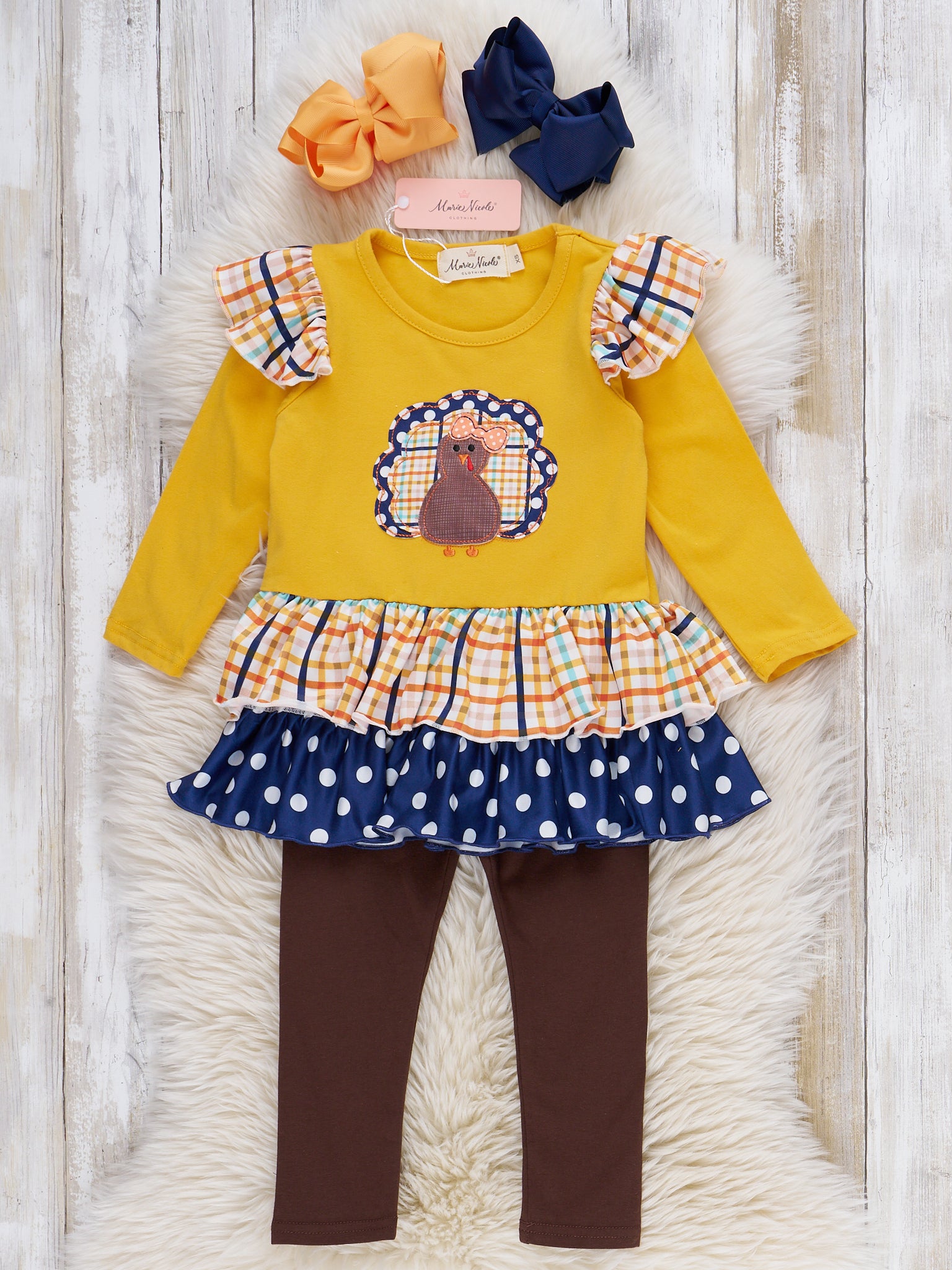 Get ready to gobble up all the cuteness with our Yellow Plaid Embroidered Turkey Ruffle Outfi! This sibling set is perfect for your little girl with an outfit featuring a stylish yellow top with an adorable embroidered turkey & plaid & polka dot. The brown leggings add a touch of Thanksgiving charm. Gobble, gobble! 🍁🦃