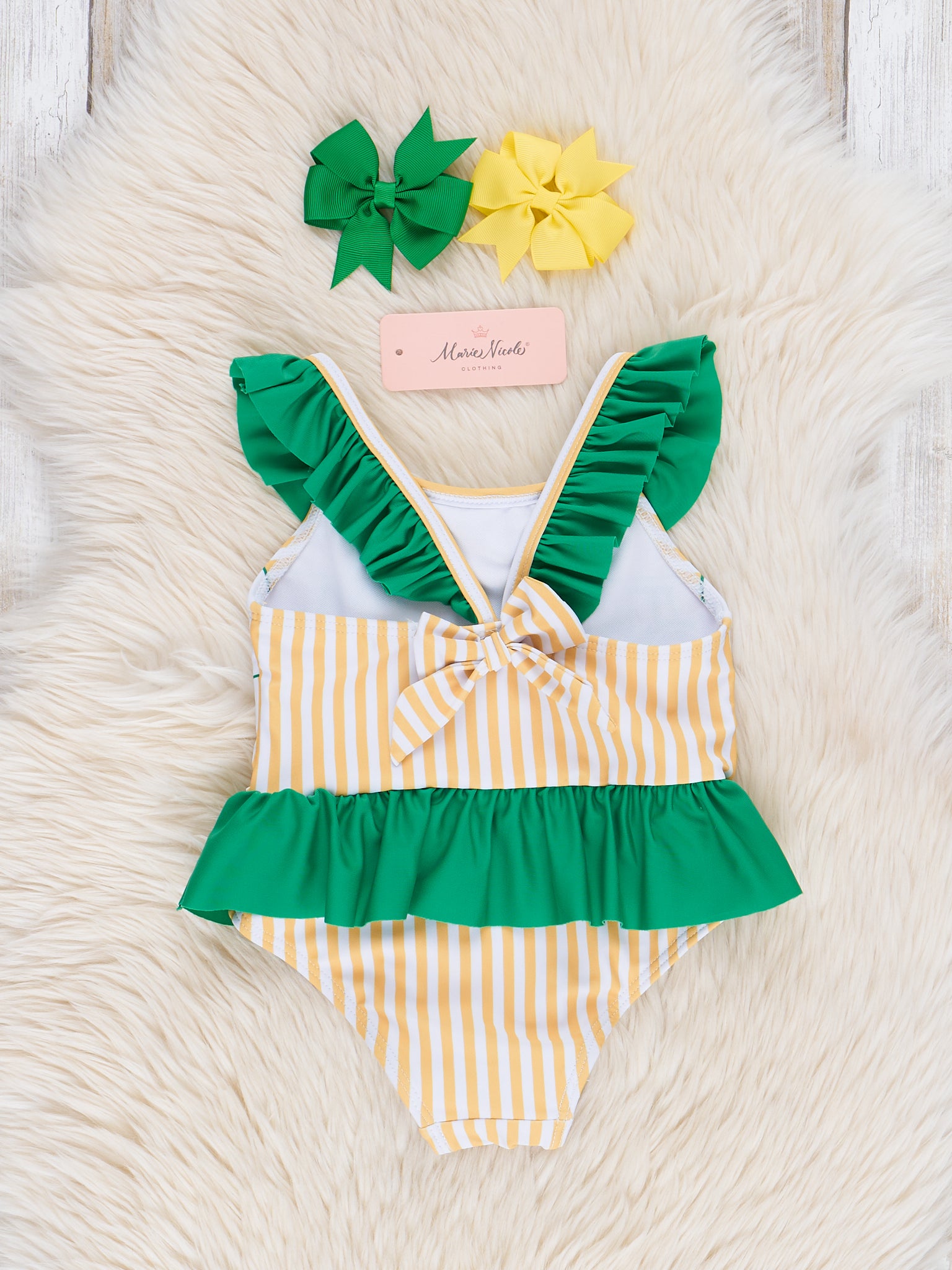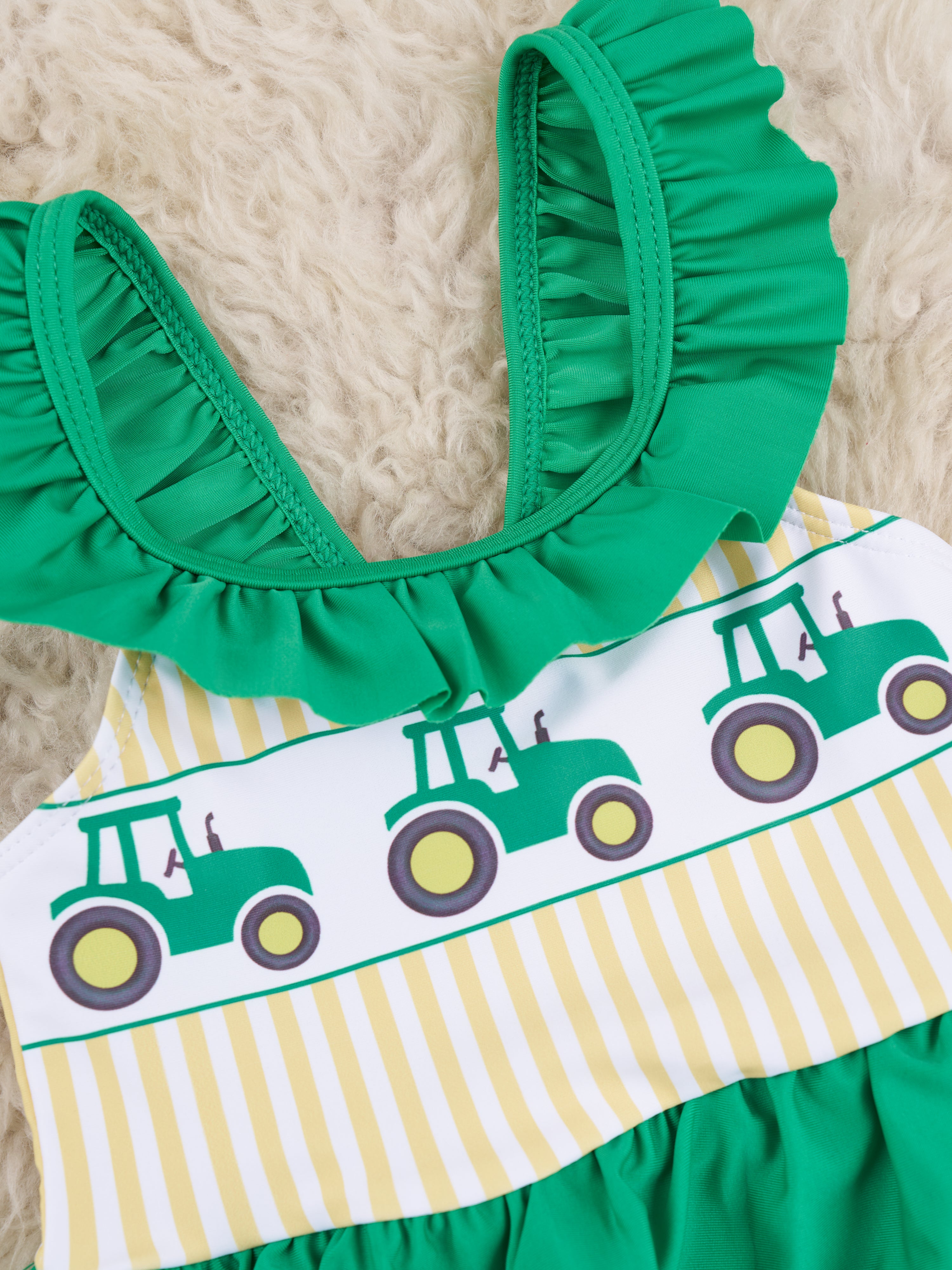 The best swimsuit set for your farm kids, by Marie Nicole Clothing! This one-piece swimsuit features yellow stripes, tractor details, green ruffle trim, a nonfunctional bow detail on the back, & a green dressy skirt.